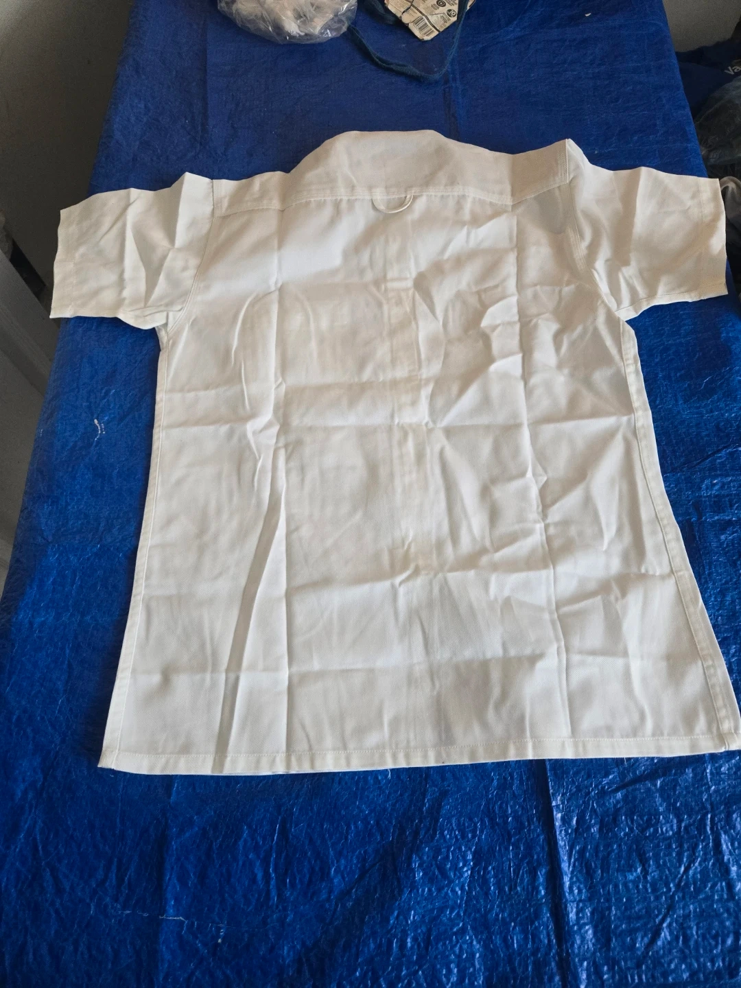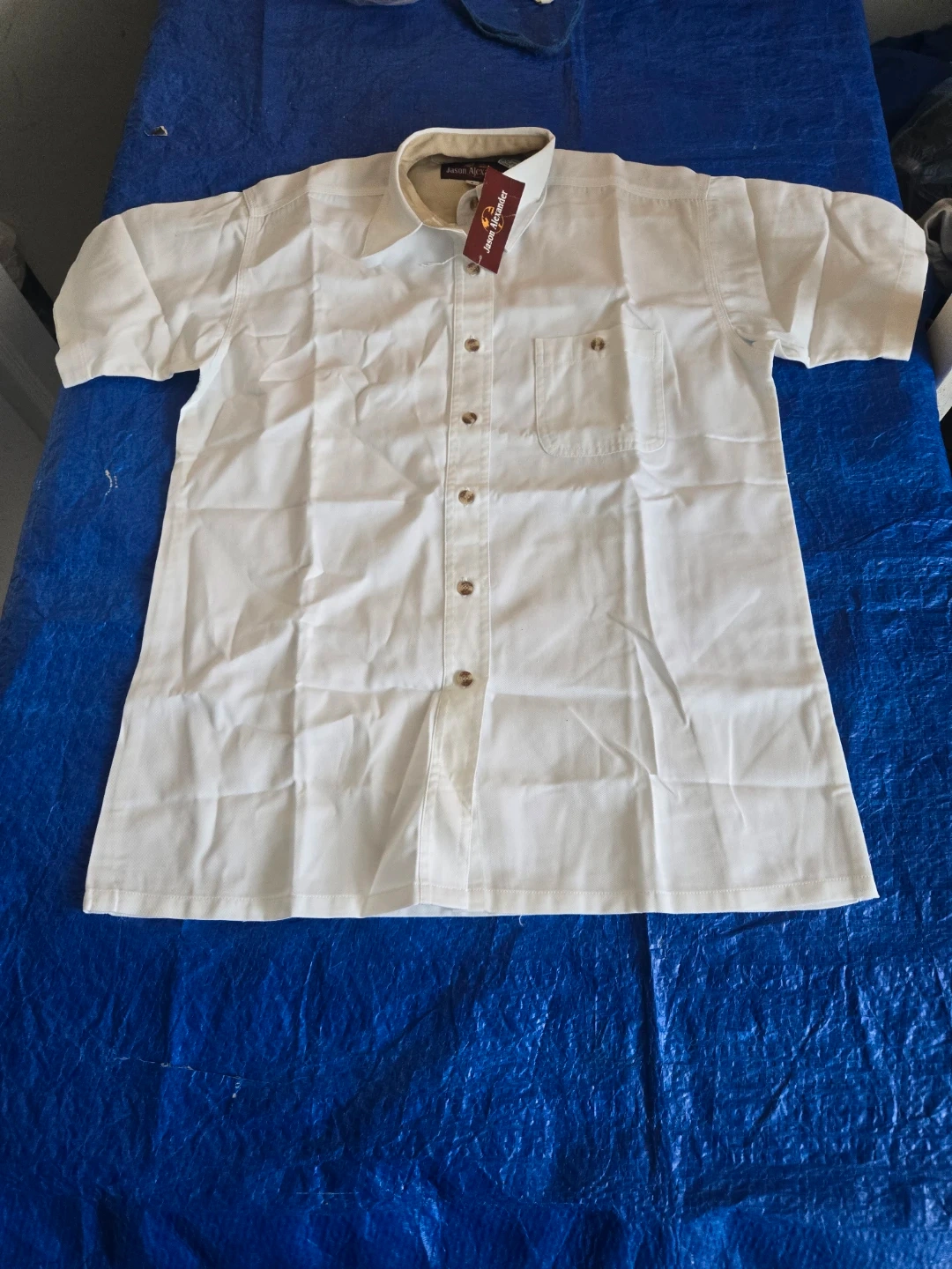 Here's a Jack Spradling white short sleeve shirt! It's in great condition and ready for a new wardrobe. Perfect for casual outings or dressing up a bit