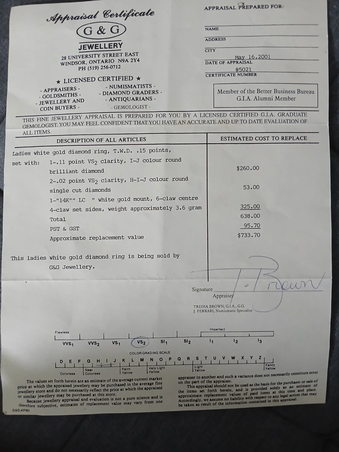 Selling a beautiful ladies white gold diamond ring. The appraisal certificate from G & G Jewellery indicates the ring has a T.W.D. of .15 points and is set with 1-1.11 point VS2 clarity, I-J colour round brilliant diamond and 2-0.02 point VS2 clarity, H-I-J colour round single cut diamonds. The ring is 14K white gold mount, 6-claw centre and 4-claw set sides, weighing approximately 3.6 grams. The approximate replacement value is $733.70!
