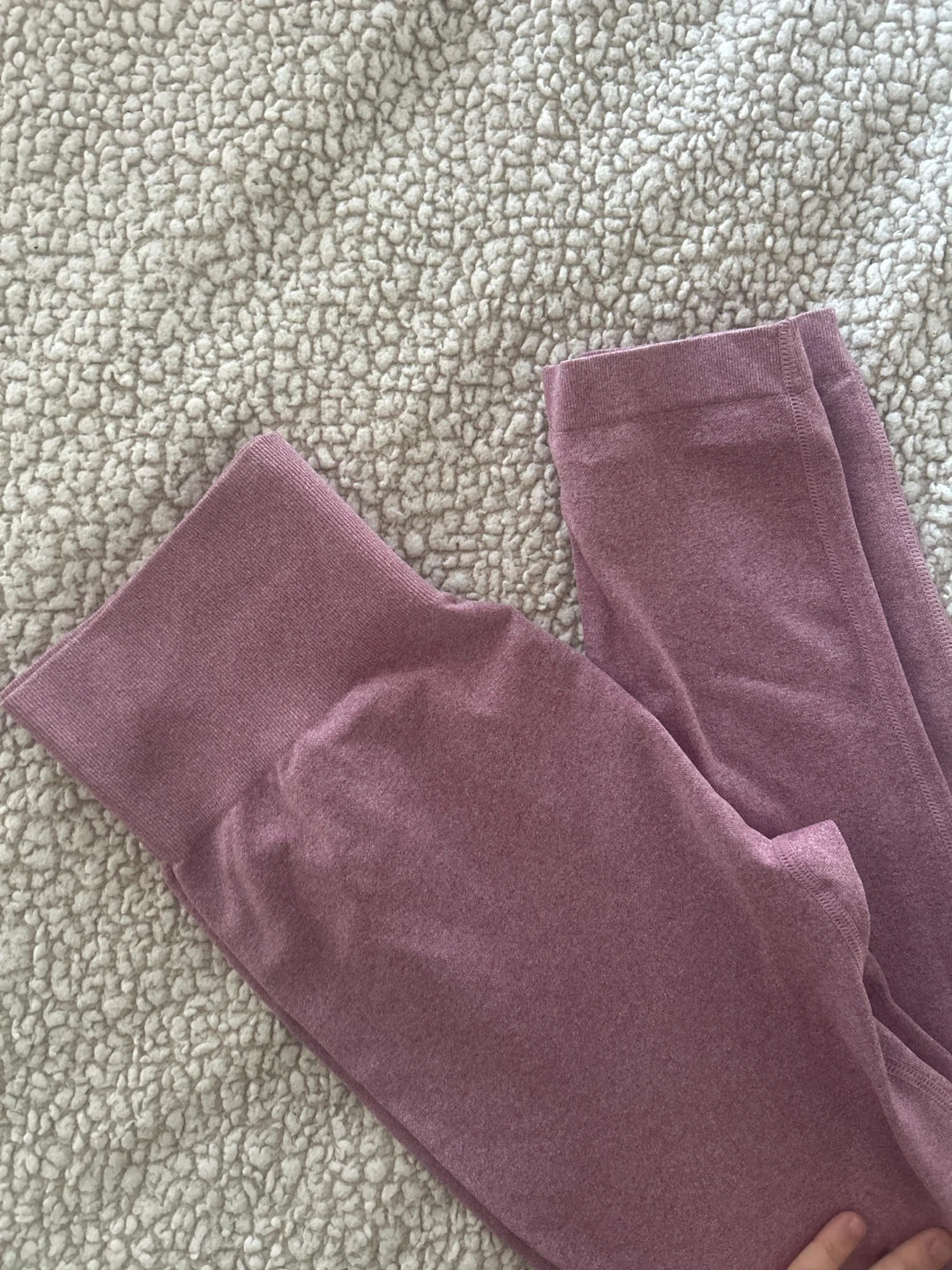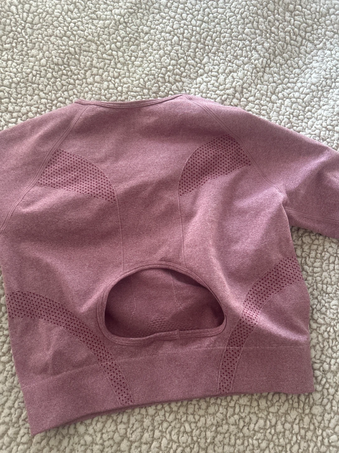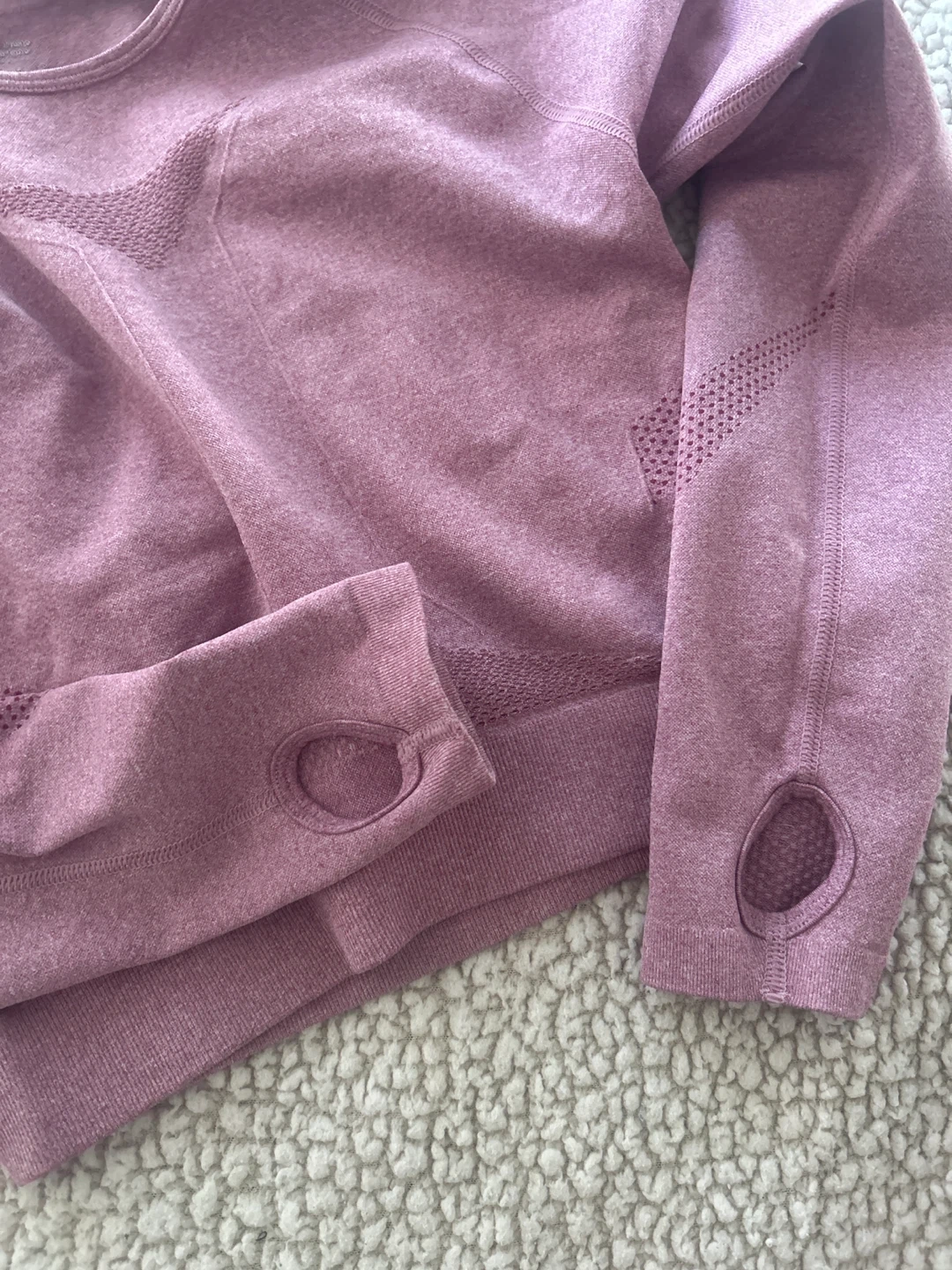 A cute mauve workout set, including a long-sleeved crop top and leggings! Perfect for your next gym session or yoga class. The top features thumb holes and a unique open-back design. The leggings have a high waistband for extra support and comfort. Both pieces are in great condition and ready for a new owner