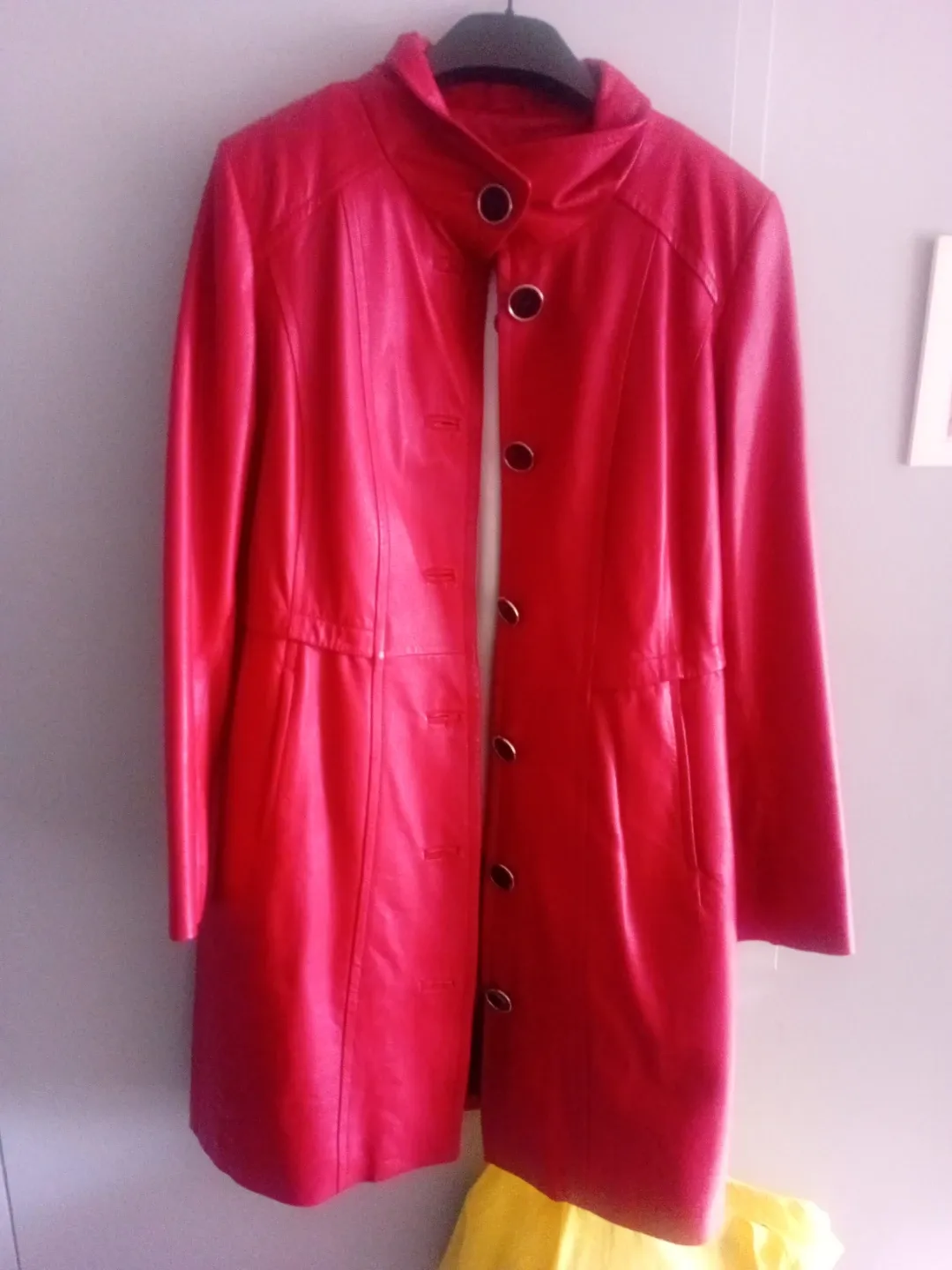 A vibrant red leather coat, perfect for adding a pop of colour to your wardrobe! It's in great condition and ready for a new owner