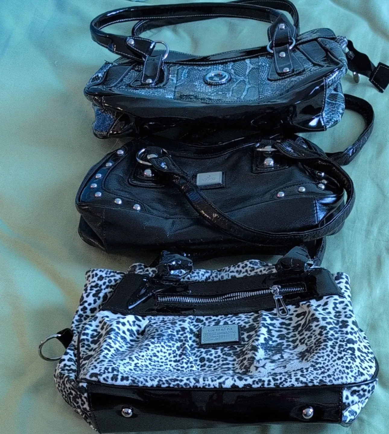 Selling a lot of 3 purses. There's a black snakeskin-style purse, a black purse with silver studs, and a black and white cheetah print purse. All in good condition and ready for a new home!