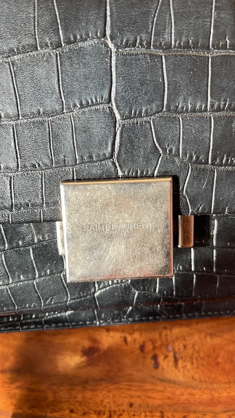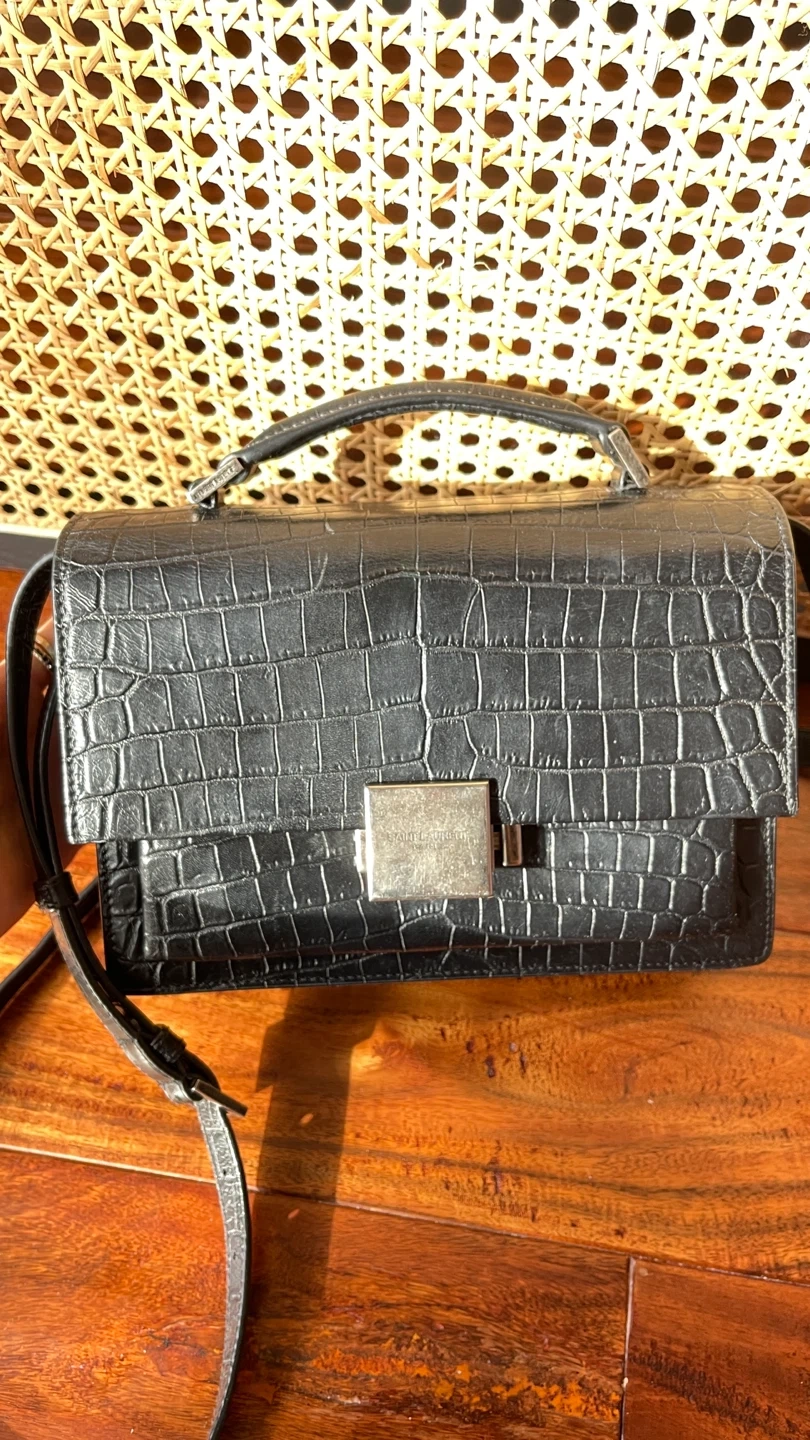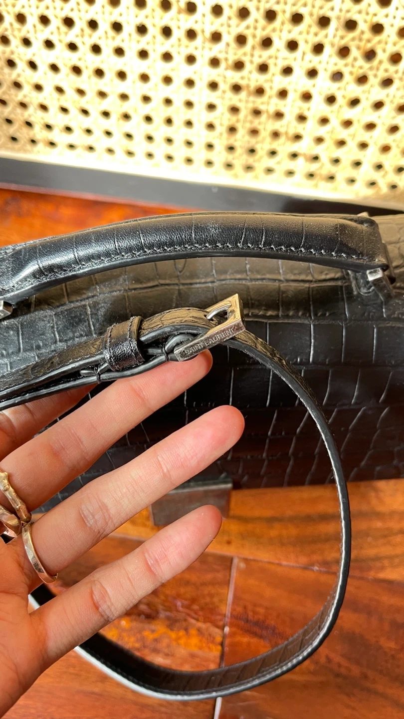 Selling a stylish Saint Laurent handbag in black embossed leather. It's a beautiful piece that adds a touch of elegance to any outfit. The bag features a handle and a shoulder strap for versatile carrying options. Inside, you'll find ample space to keep your essentials organized. Perfect for everyday use or special occasions!