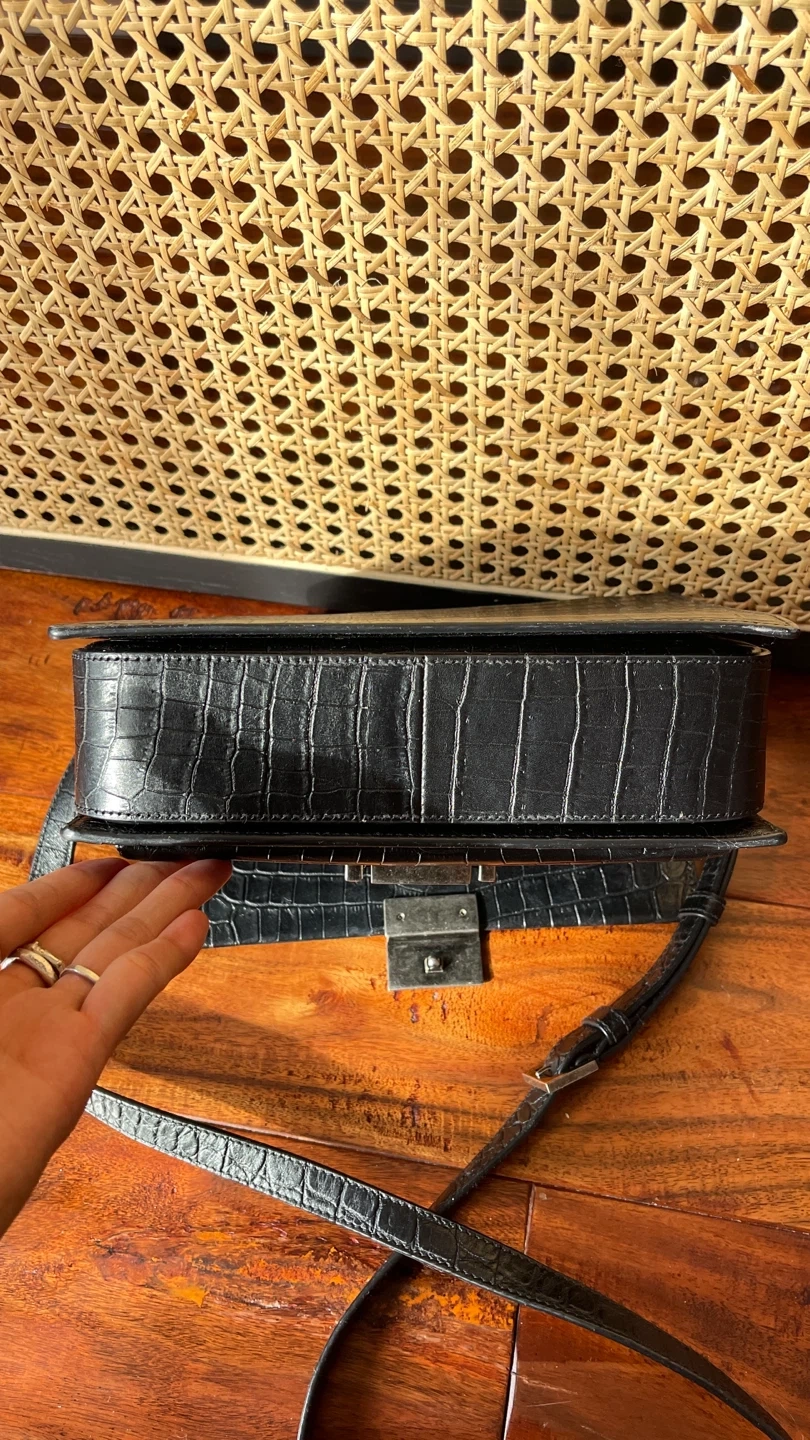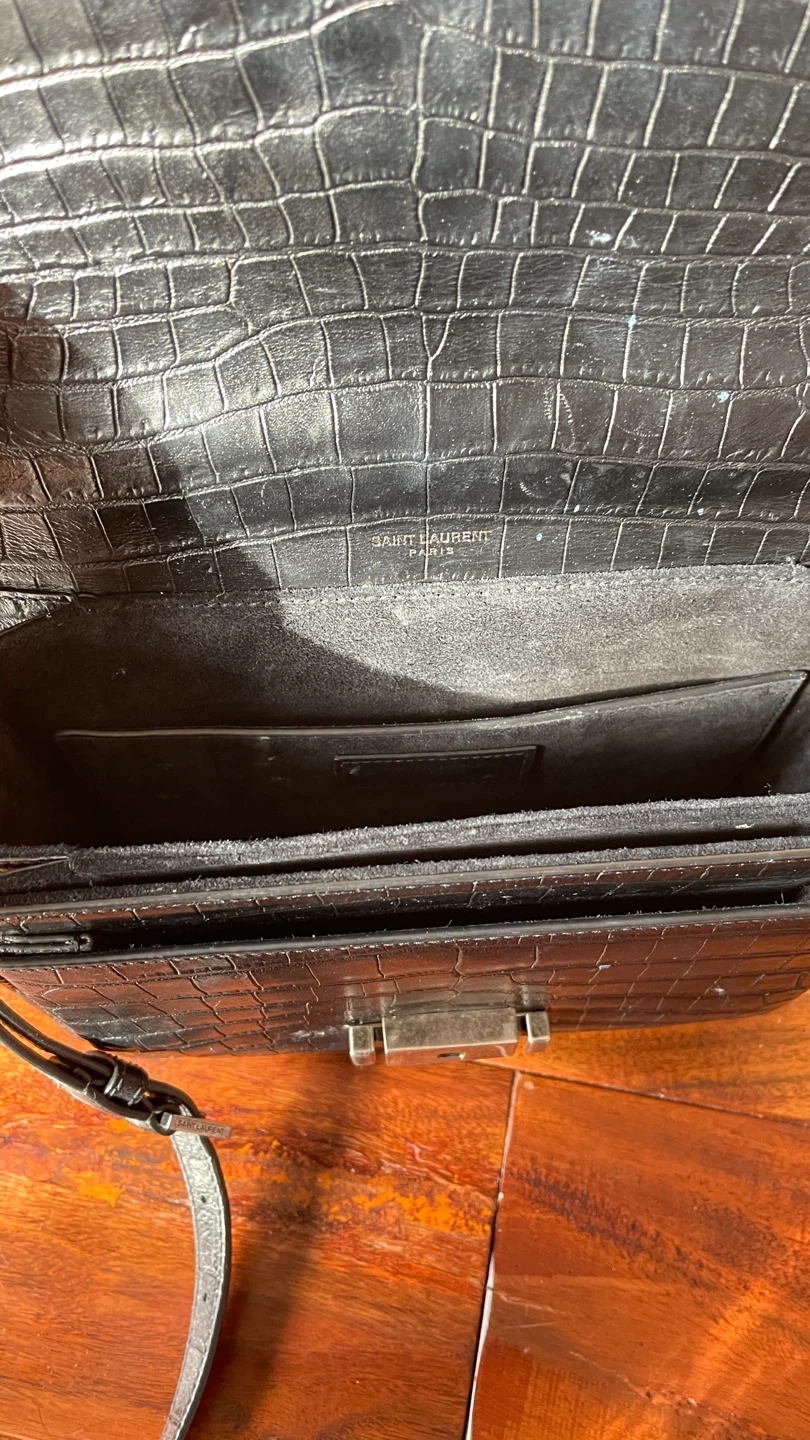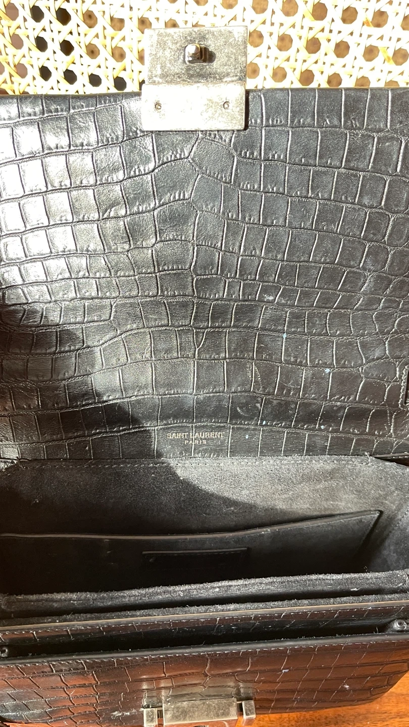 Selling a stylish Saint Laurent handbag in black embossed leather. It's a beautiful piece that adds a touch of elegance to any outfit. The bag features a handle and a shoulder strap for versatile carrying options. Inside, you'll find ample space to keep your essentials organized. Perfect for everyday use or special occasions!