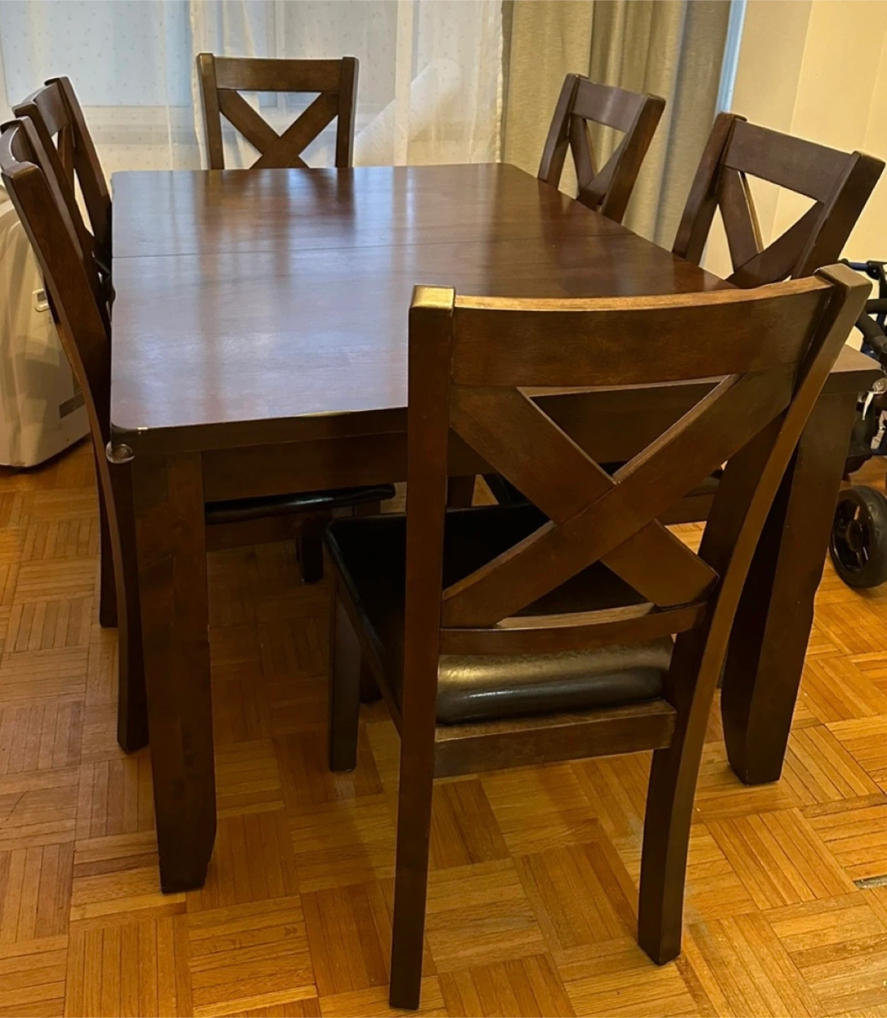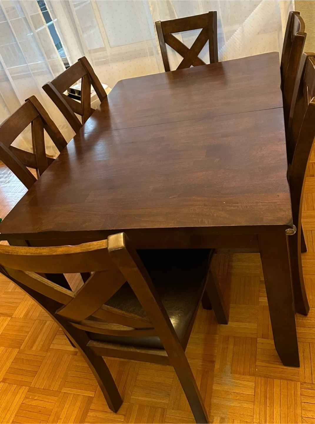 Full 7pc Dining Set (originally from The Brick): comes with Table (which is 60” regularly, and can extend to 78” with leaf extension piece) & 6 ver comfy Chairs. Table is made from lovely deep brown, solid Asian hardwood timbers. Minor imperfections on surface of table from wear & water stains - can be refinished or used as-is.