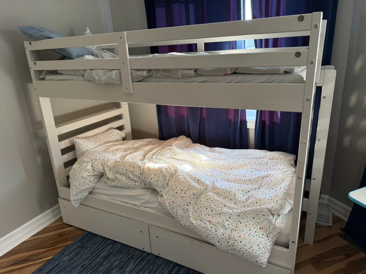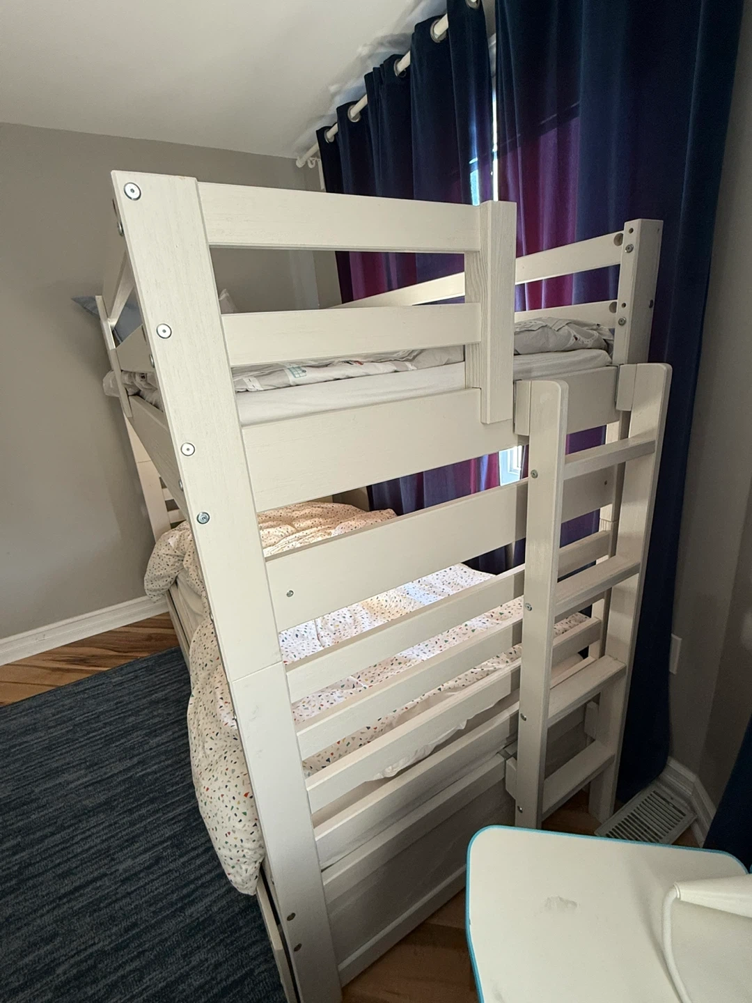 Selling a bunk bed in great condition! It's a sturdy, white wood frame that would be perfect for a kids' room or guest room. The frame is easy to assemble and disassemble, making it convenient for moving. It has a clean and simple design that fits well with any decor. There are some minor signs of use, but overall it's in excellent shape and ready for a new home!