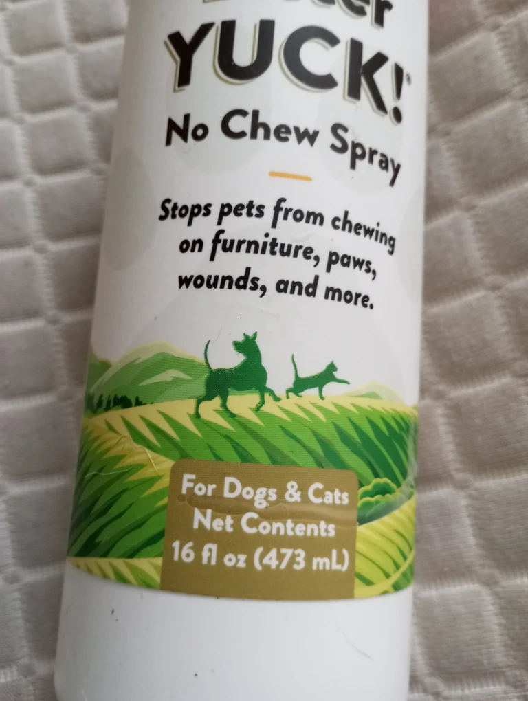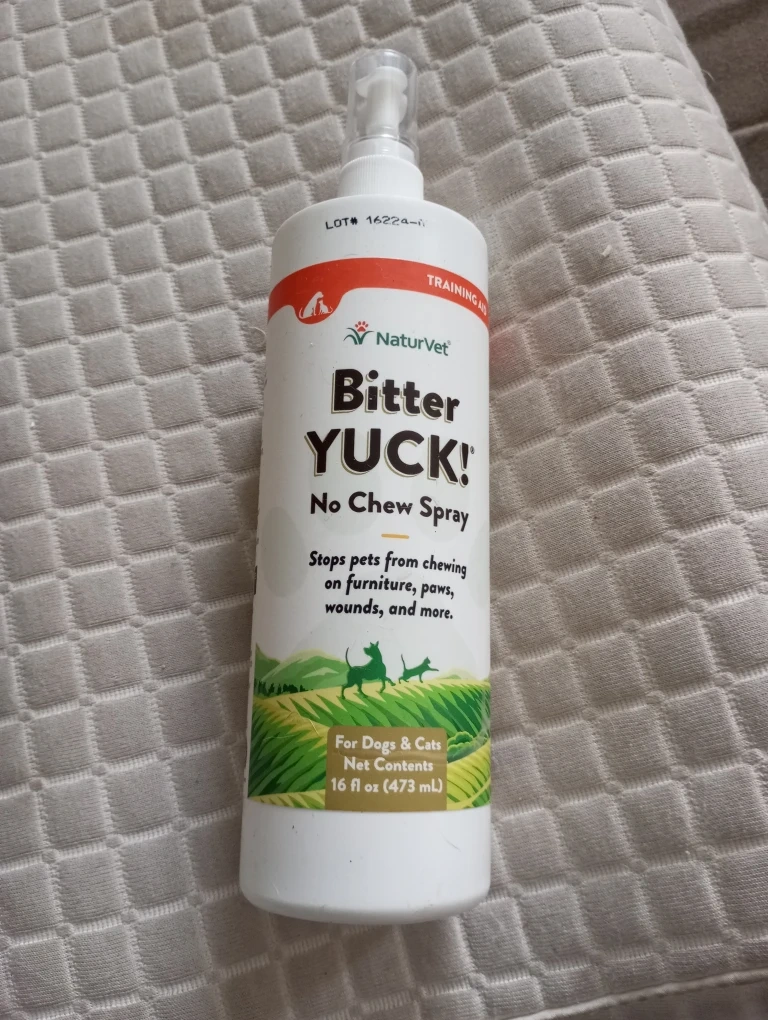 Selling a bottle of NaturVet Bitter YUCK! No Chew Spray. It's designed to stop pets from chewing on furniture, paws, wounds, and more. Great for both dogs and cats! The bottle contains 16 fl oz (473 mL)