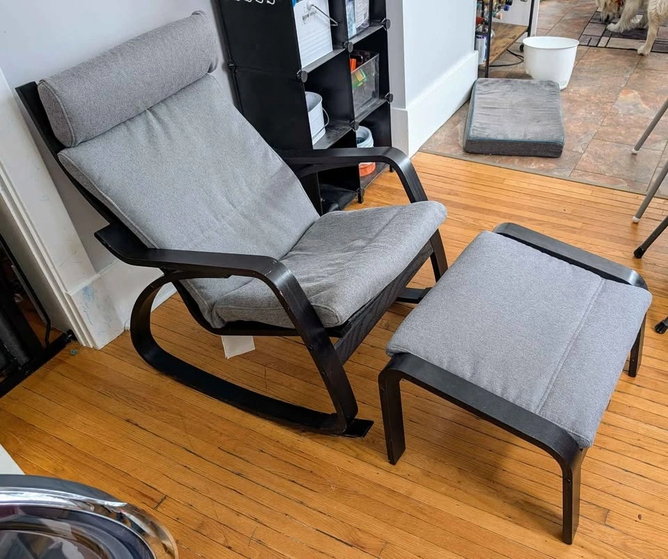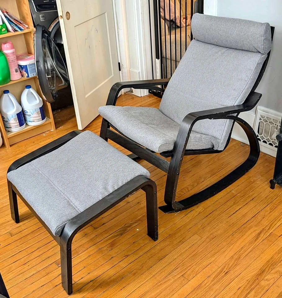 POÄNG rocking chair has stylish curved lines in bentwood, providing nice support for the neck. The rocking feature adds an extra dimension to the comfort, allowing you to fully relax. Enjoy rocking!