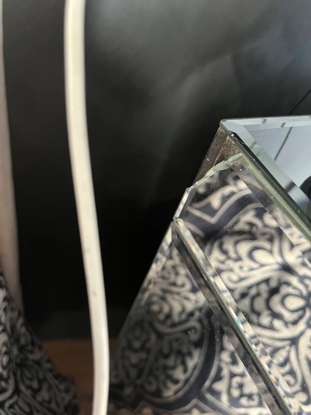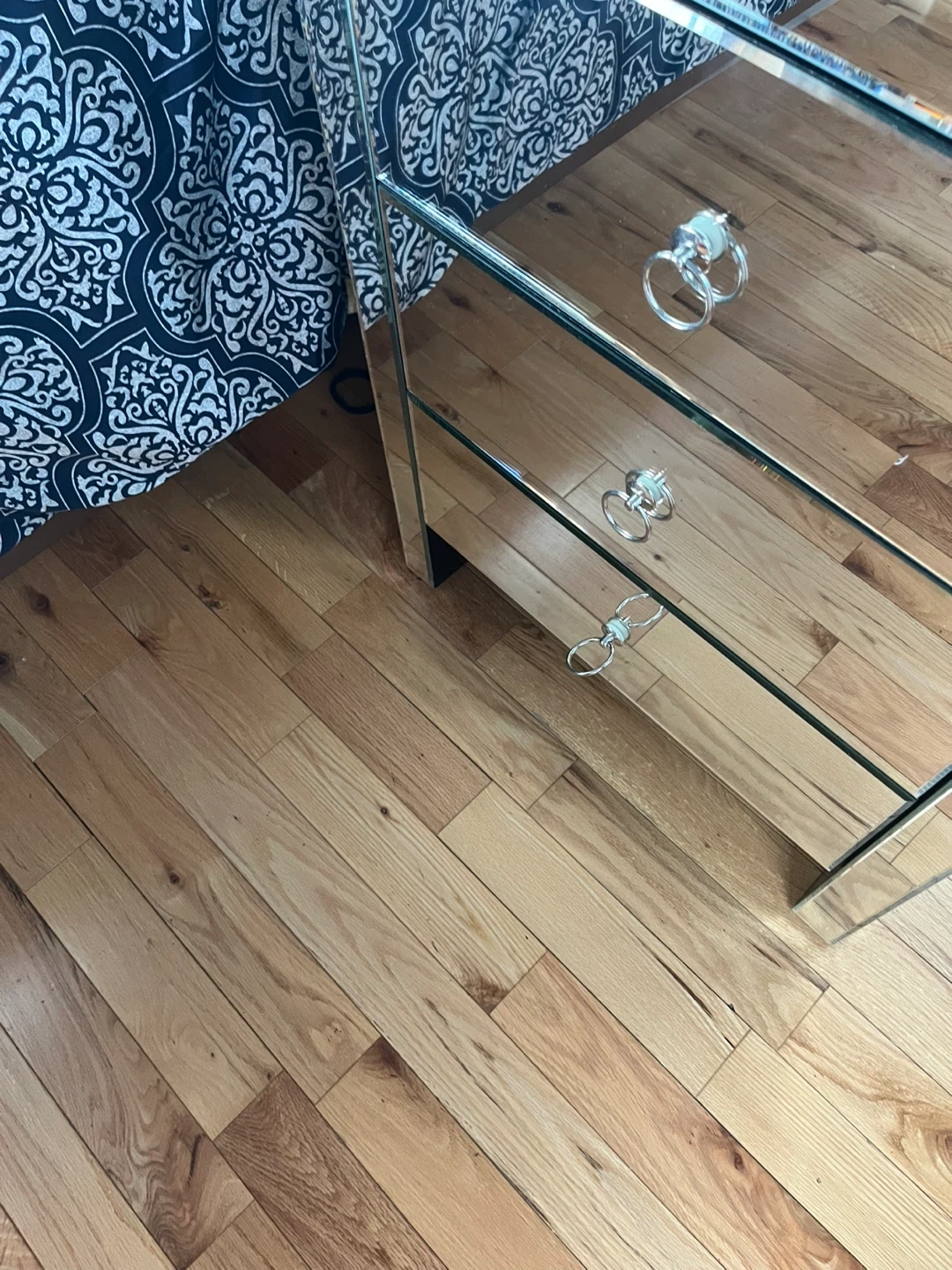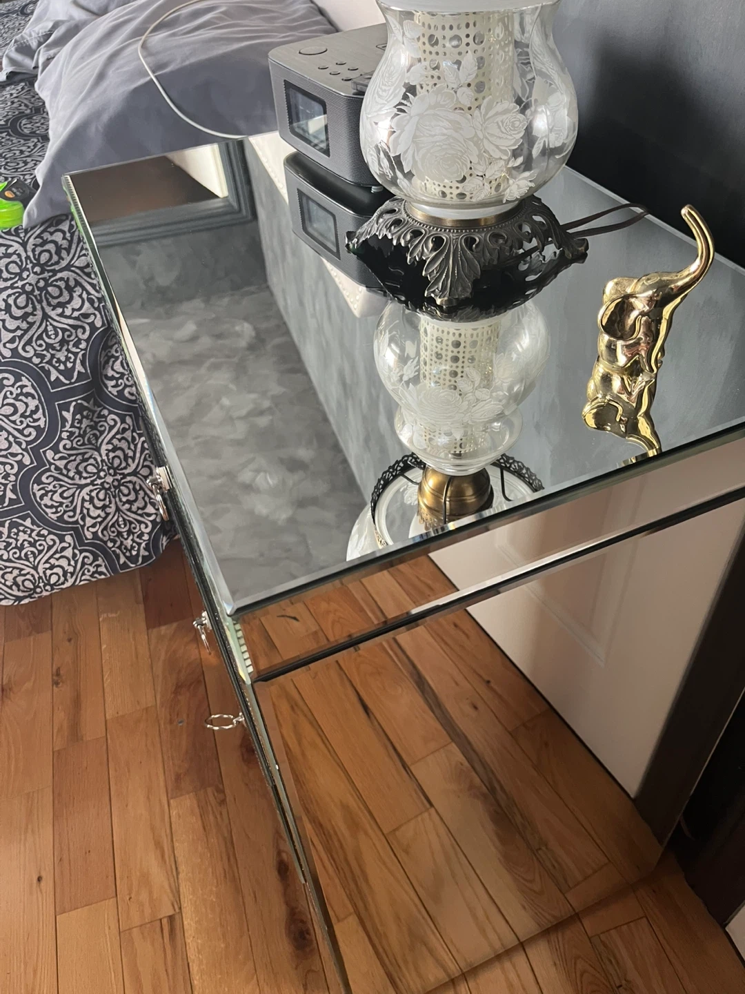 Selling a mirrored nightstand with three drawers. It's in good condition and would be a lovely addition to any bedroom. It has a small crack seen in picture.