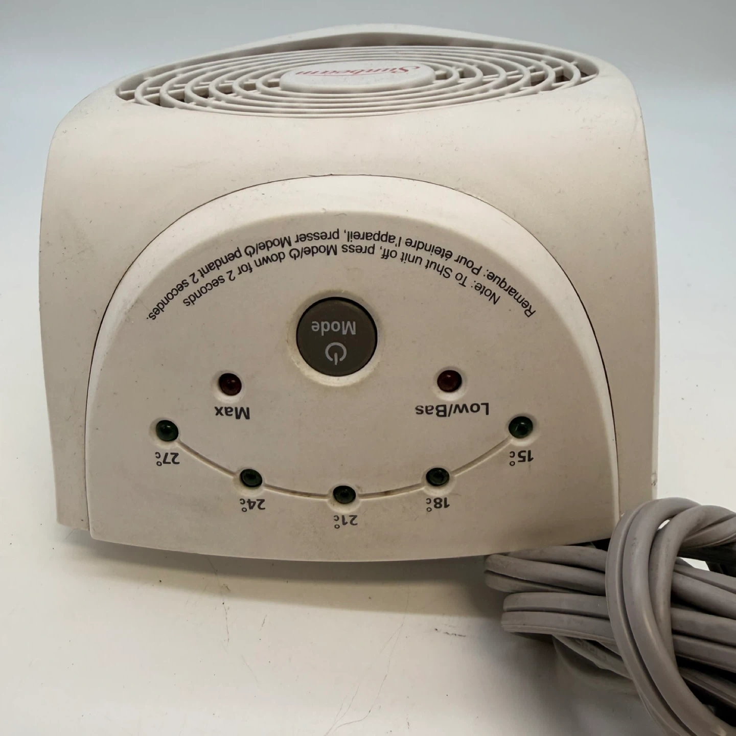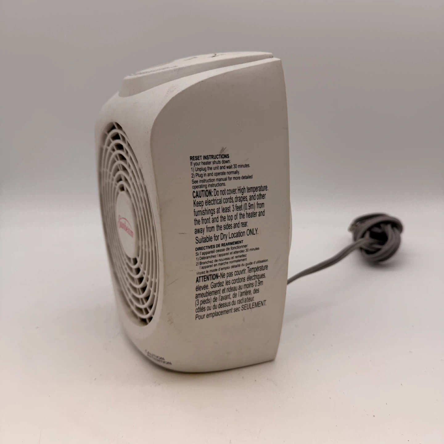 Sunbeam compact portable electric space heater in good working condition. Ideal for bedrooms, offices, dorm rooms, or small spaces. Heats quickly and has adjustable temperature settings for comfort.