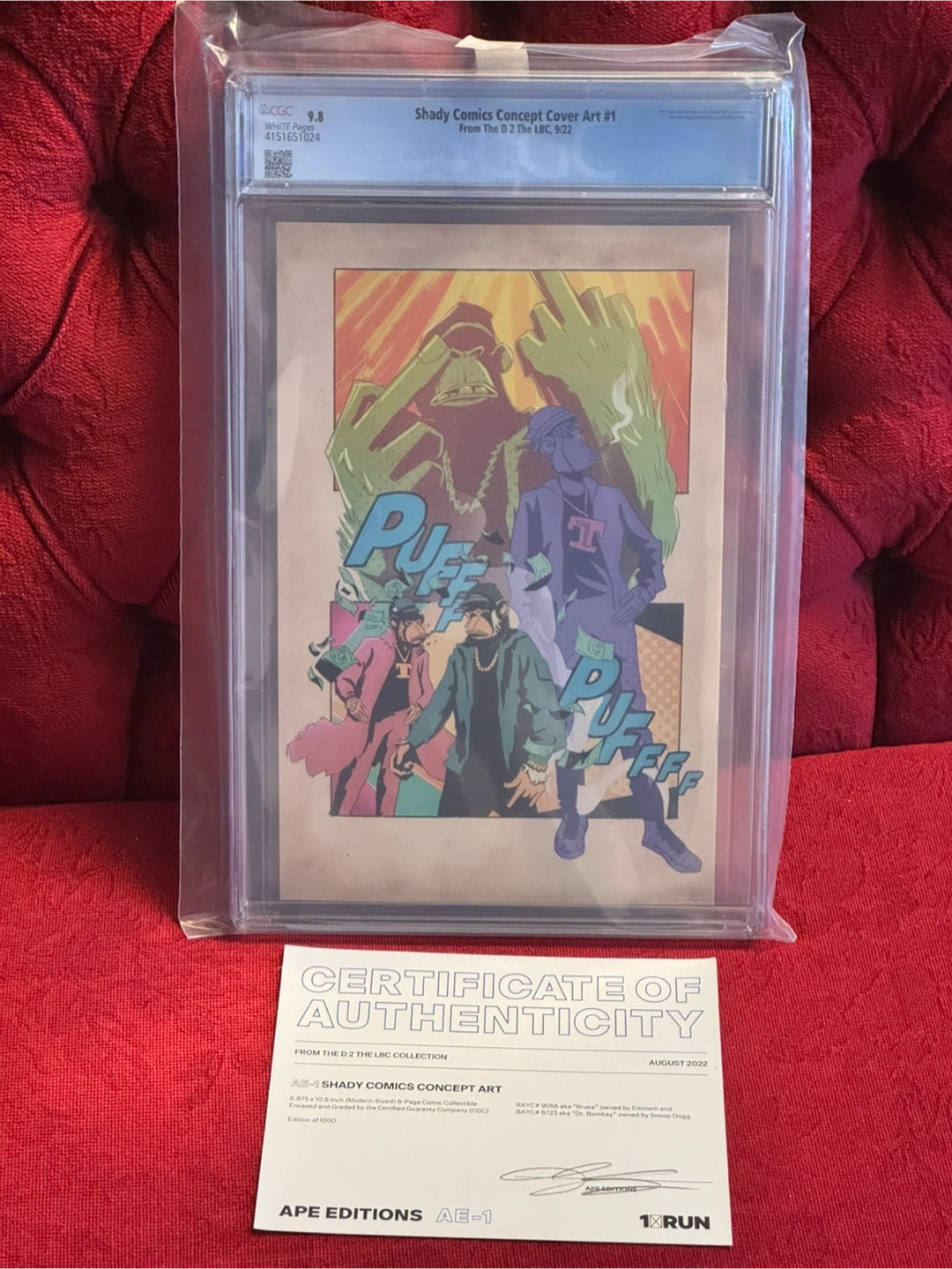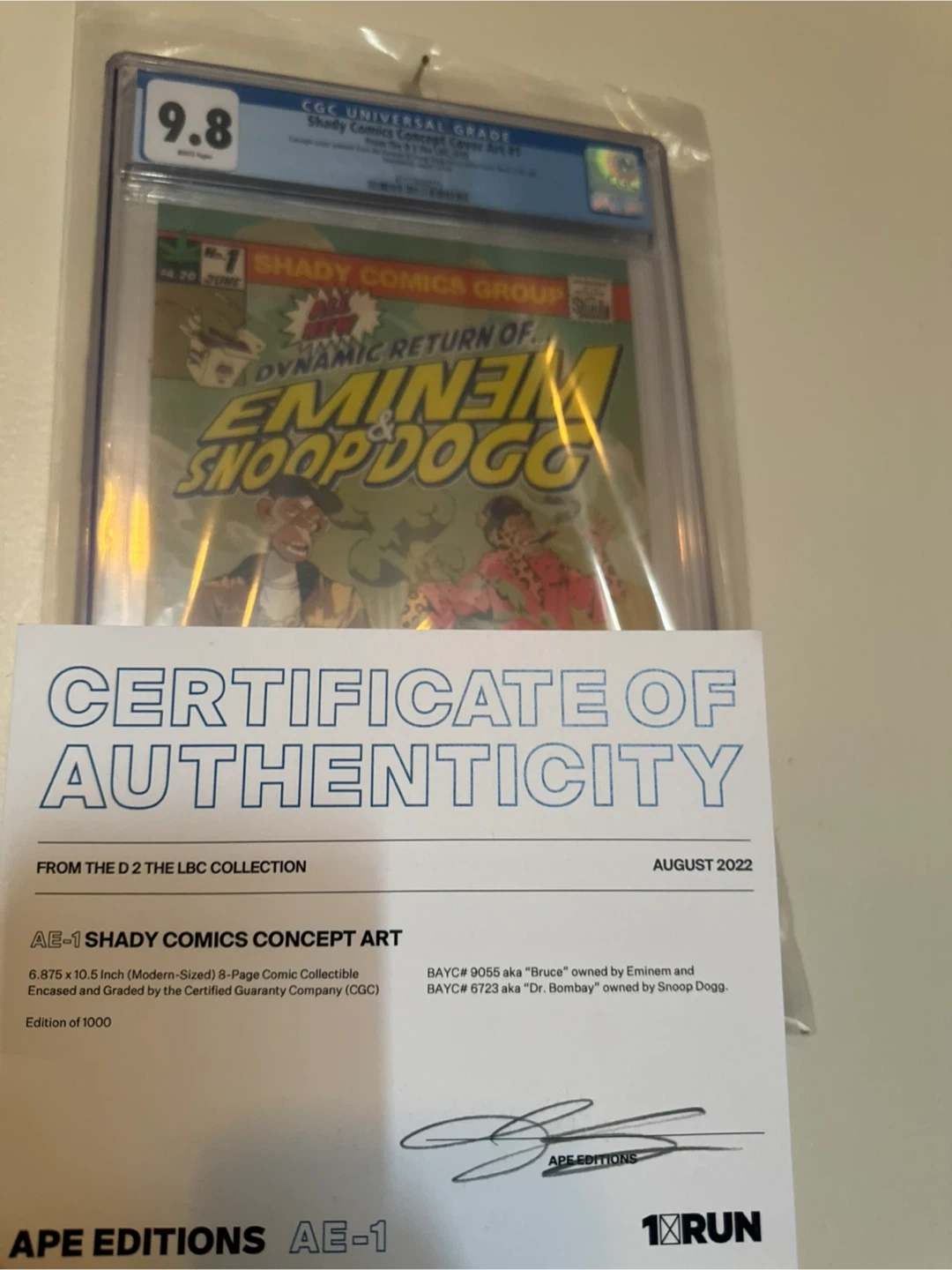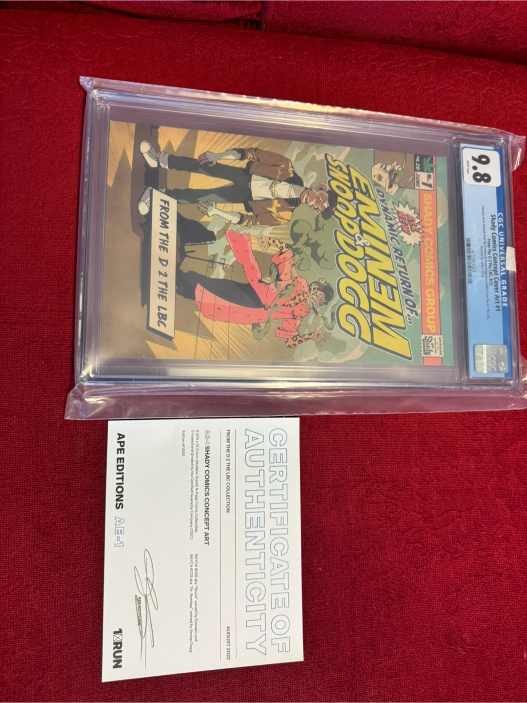 Selling a graded comic book featuring Eminem and Snoop Dogg, Shady Comics Concept Cover Art #1. It has a CGC grade of 9.8. This is from the D 2 The LBC collection. It measures 6.875 x 10.5 inches and is encased and graded by the Certified Guaranty Company (CGC). Edition of 1000. Also includes a certificate of authenticity.