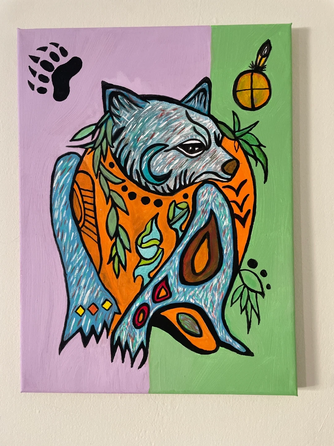 A vibrant canvas painting featuring a stylized wolf design with Indigenous art elements. The artwork showcases a unique colour palette and symbolic imagery, including a bear paw print and a feather. It's a striking piece that would complement any wall decor.