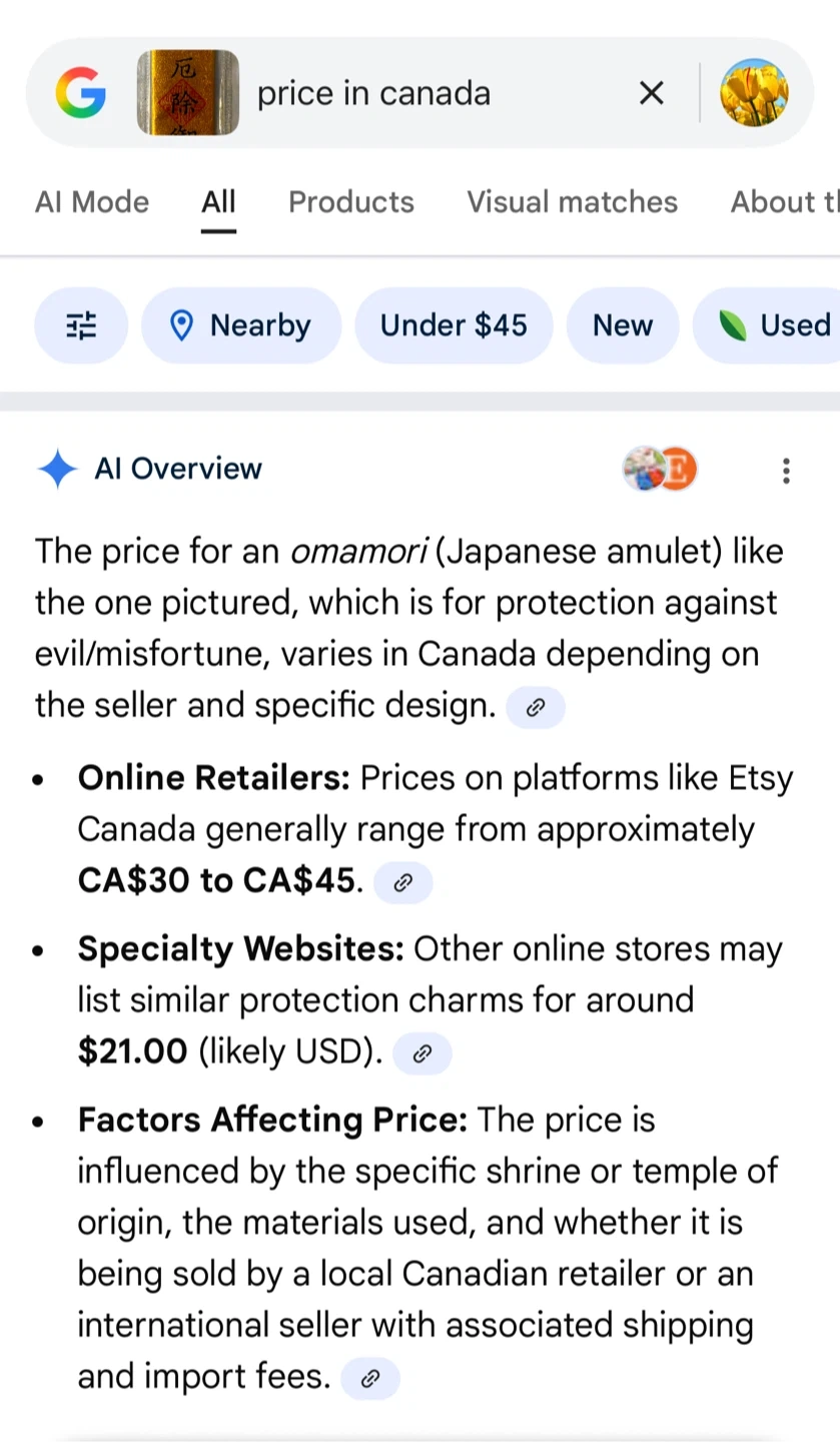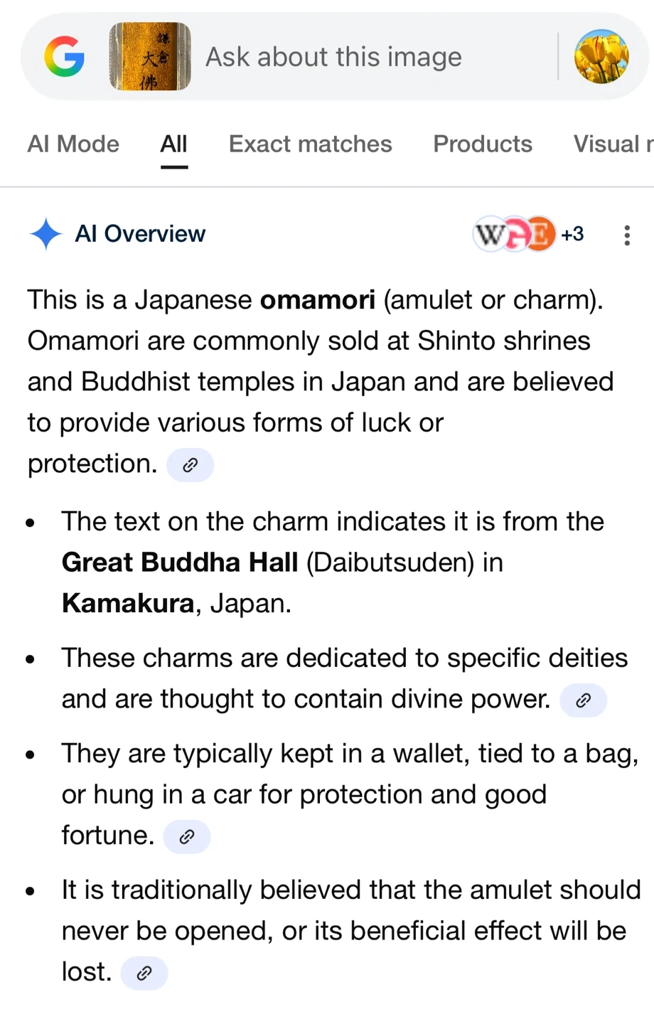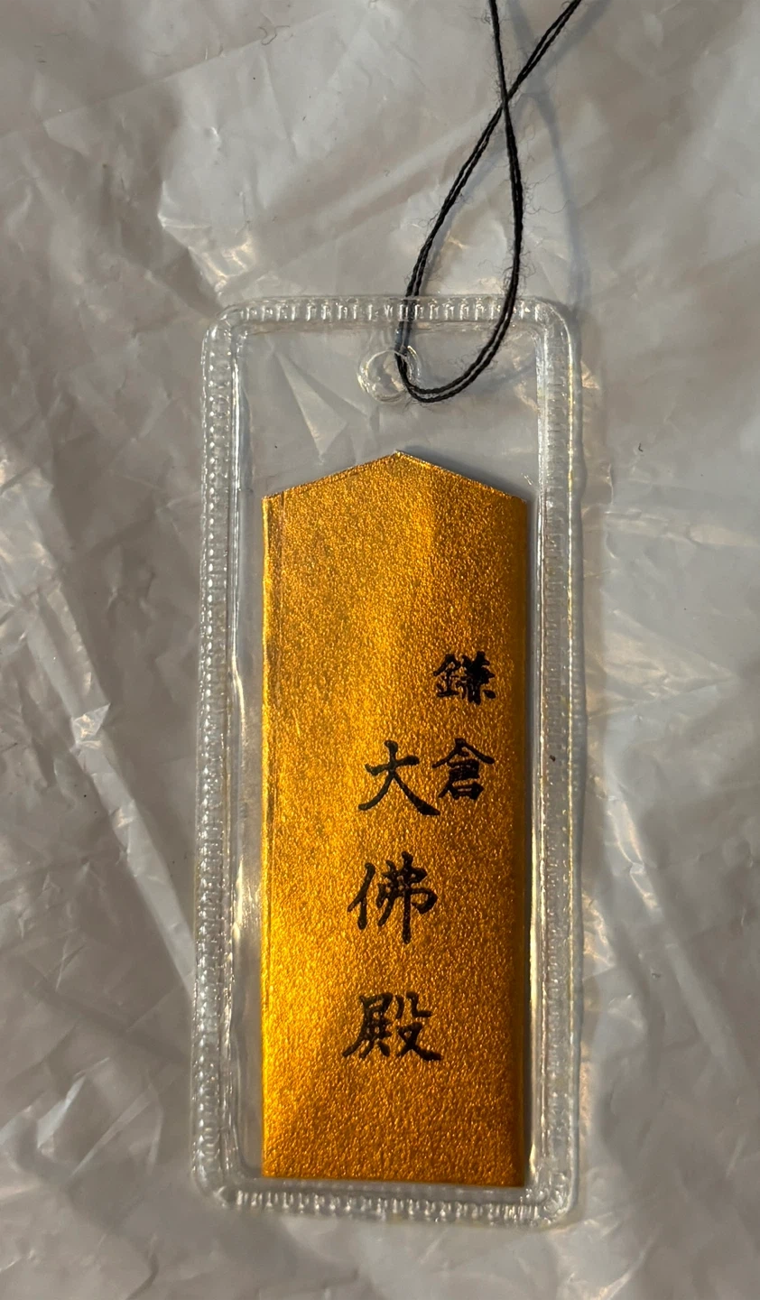 Japanese Omamori amulet charm .. in a gift envelope with card. It's believed to provide various forms of luck or protection. The text indicates it's from the Great Buddha Hall (Daibutsuden) in Kamakura, Japan. They are typically kept in a wallet, tied to a bag, or hung in a car for protection and good fortune. It is also a great Japanese collectible and a gift item!