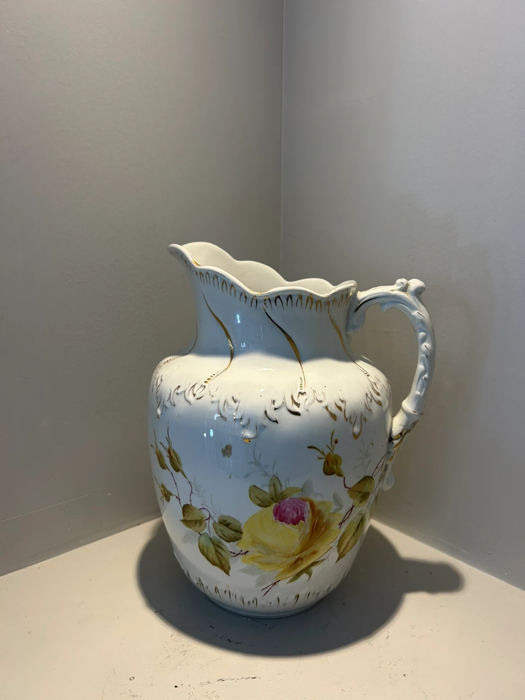 Beautiful large antique English pitcher by A.J. Wilkinson Ltd of Staffordshire. Marked “Royal Semi Porcelain – A.J. Wilkinson – England” on the base (common late 1800s–early 1900s). Hand-painted floral design with yellow roses and gilt accents, scalloped rim and ornate handle.