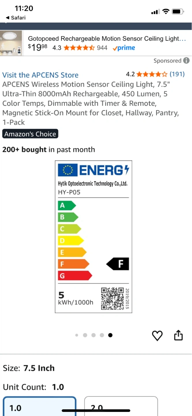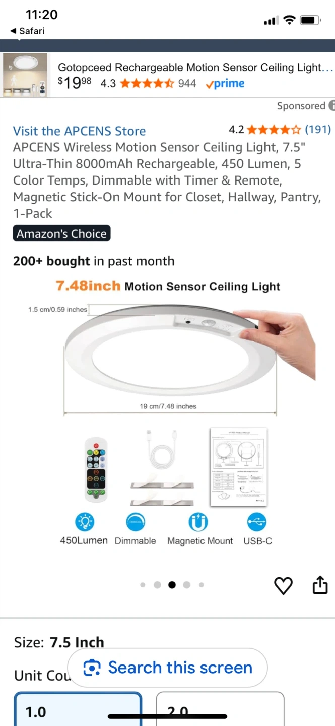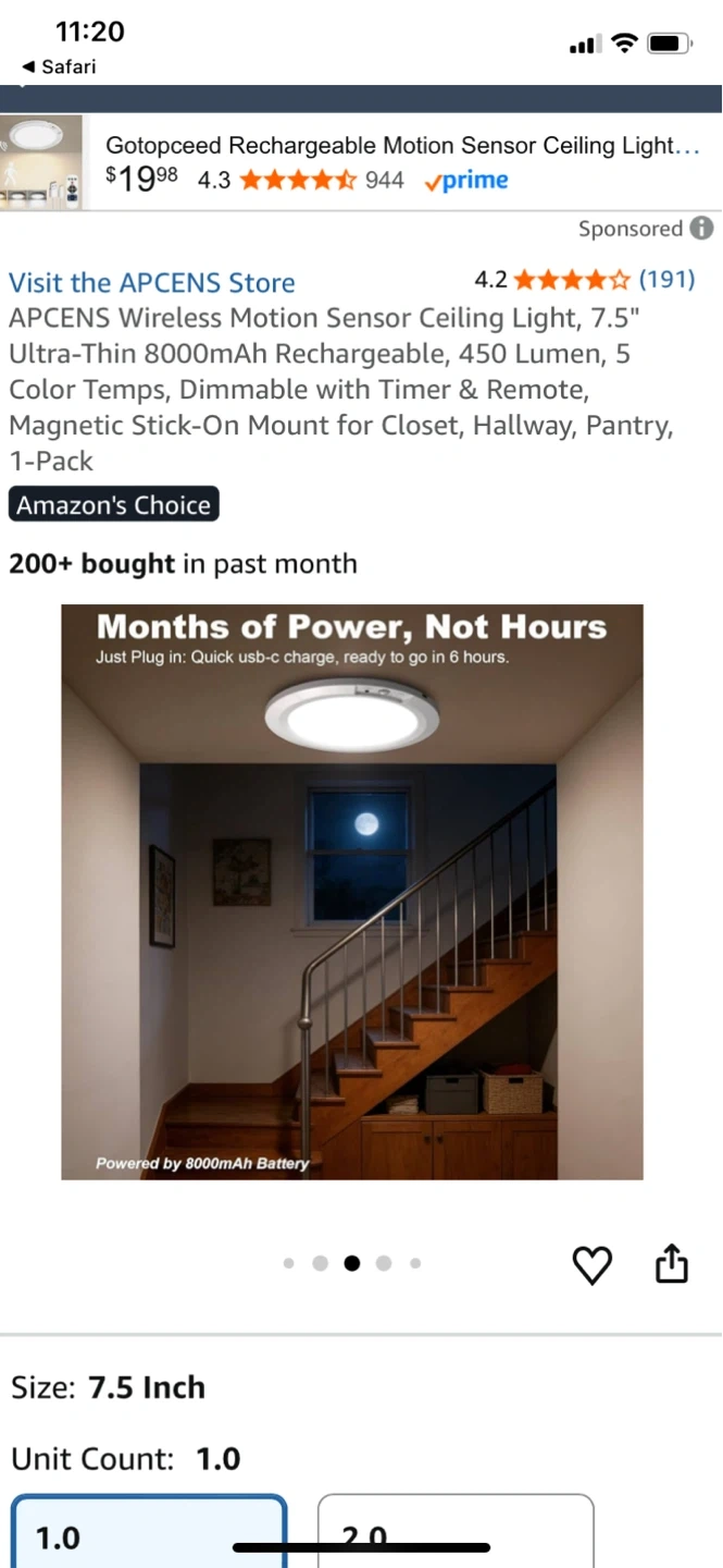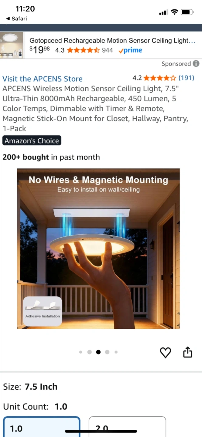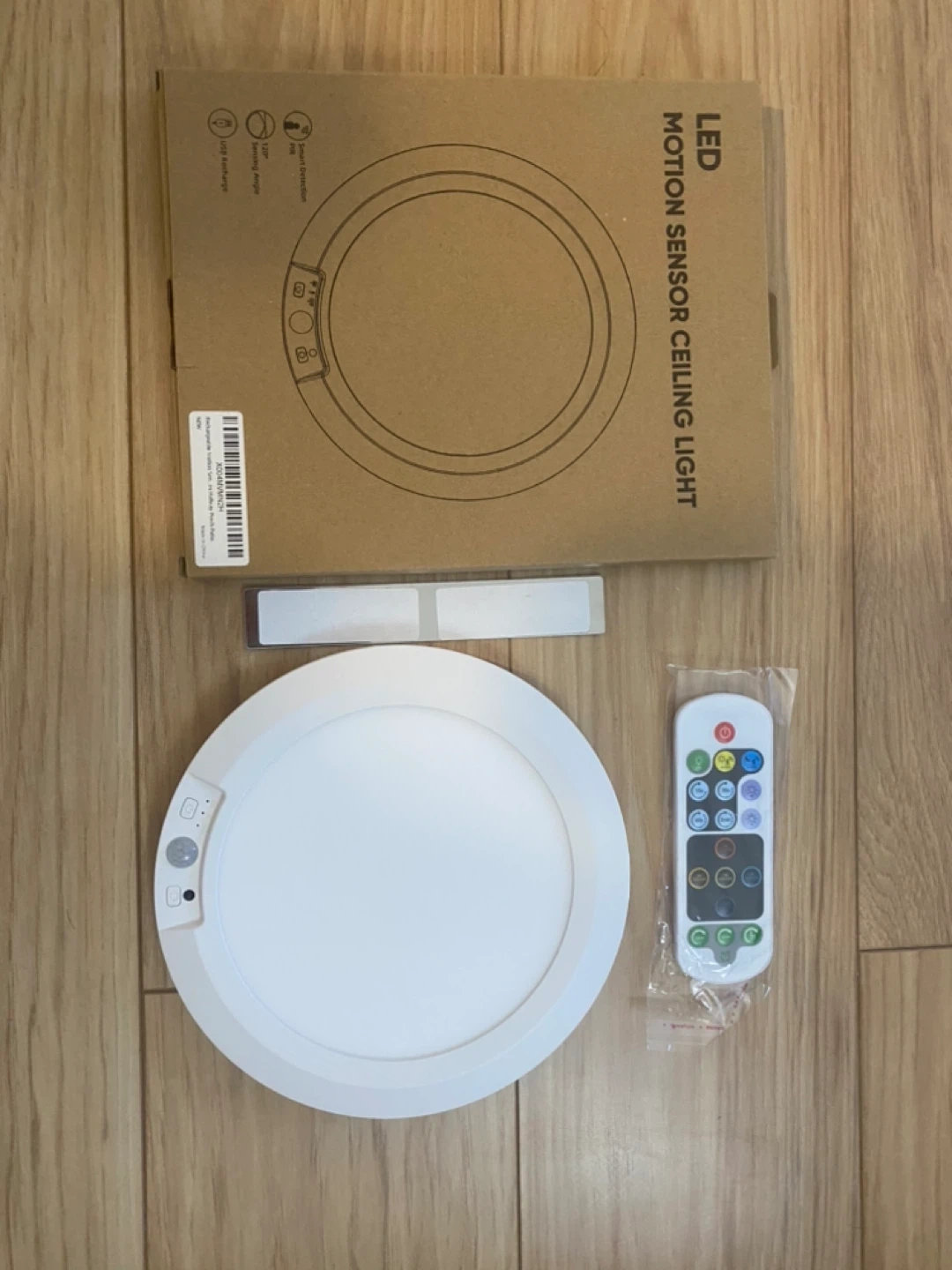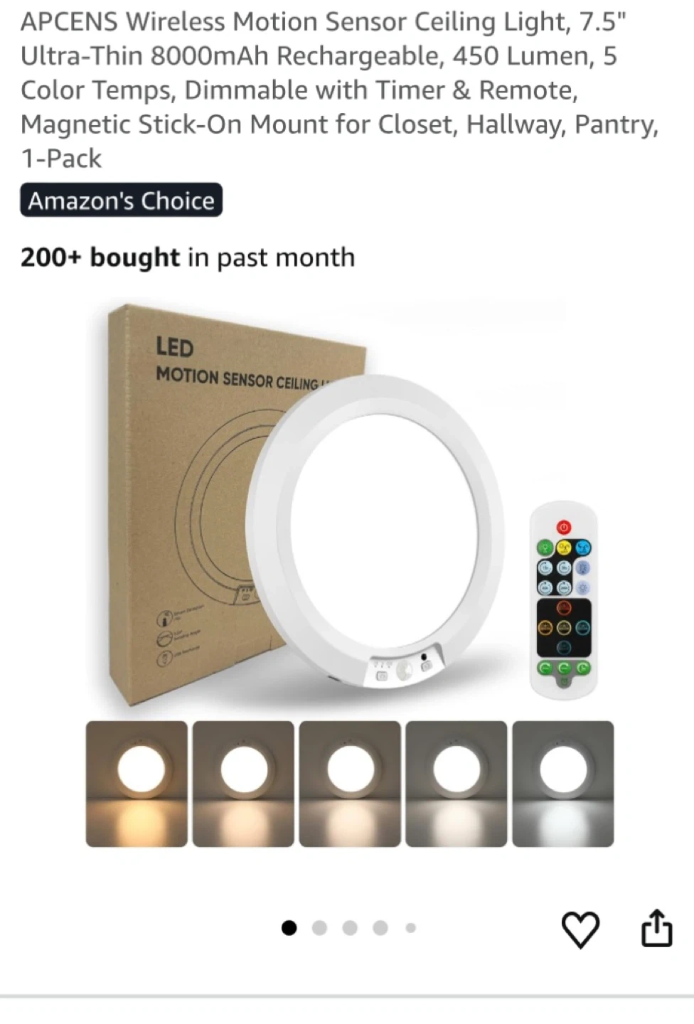 Selling an APCENS wireless motion sensor ceiling light! It's 7.5 inches and rechargeable. It's ultra-thin with an 8000mAh battery and 450 Lumens. It has 5 color temps and is dimmable with a timer and remote. Includes a magnetic stick-on mount for closet, hallway, or pantry