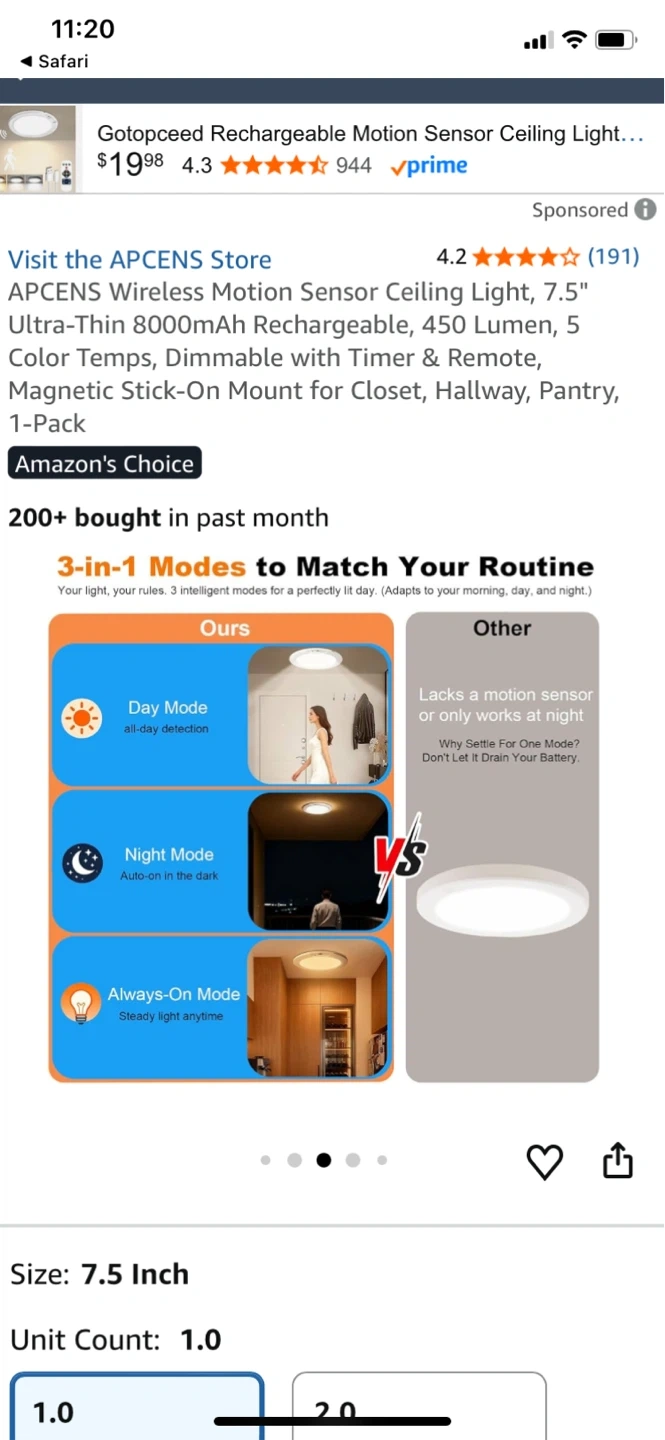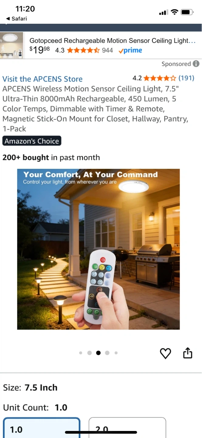 Selling an APCENS wireless motion sensor ceiling light! It's 7.5 inches and rechargeable. It's ultra-thin with an 8000mAh battery and 450 Lumens. It has 5 color temps and is dimmable with a timer and remote. Includes a magnetic stick-on mount for closet, hallway, or pantry