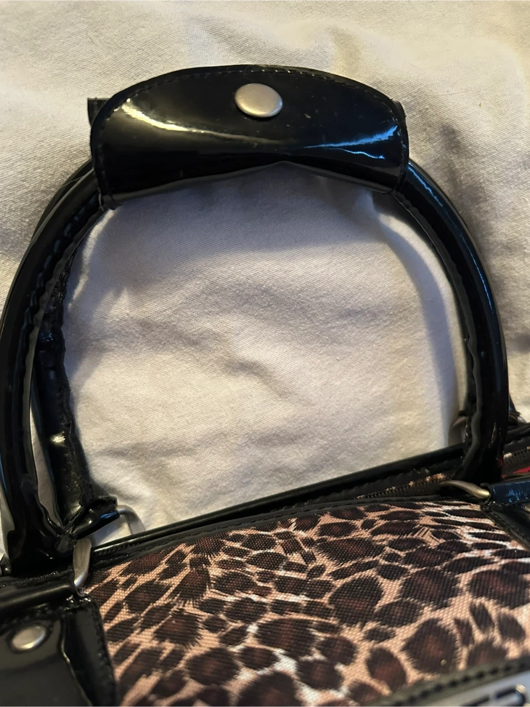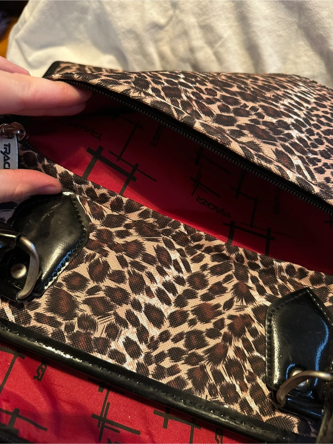 Never used Tracker bag in leopard print. It has a nice red interior and a ton of pockets. It’s actually crazy how many pockets this bag has lol