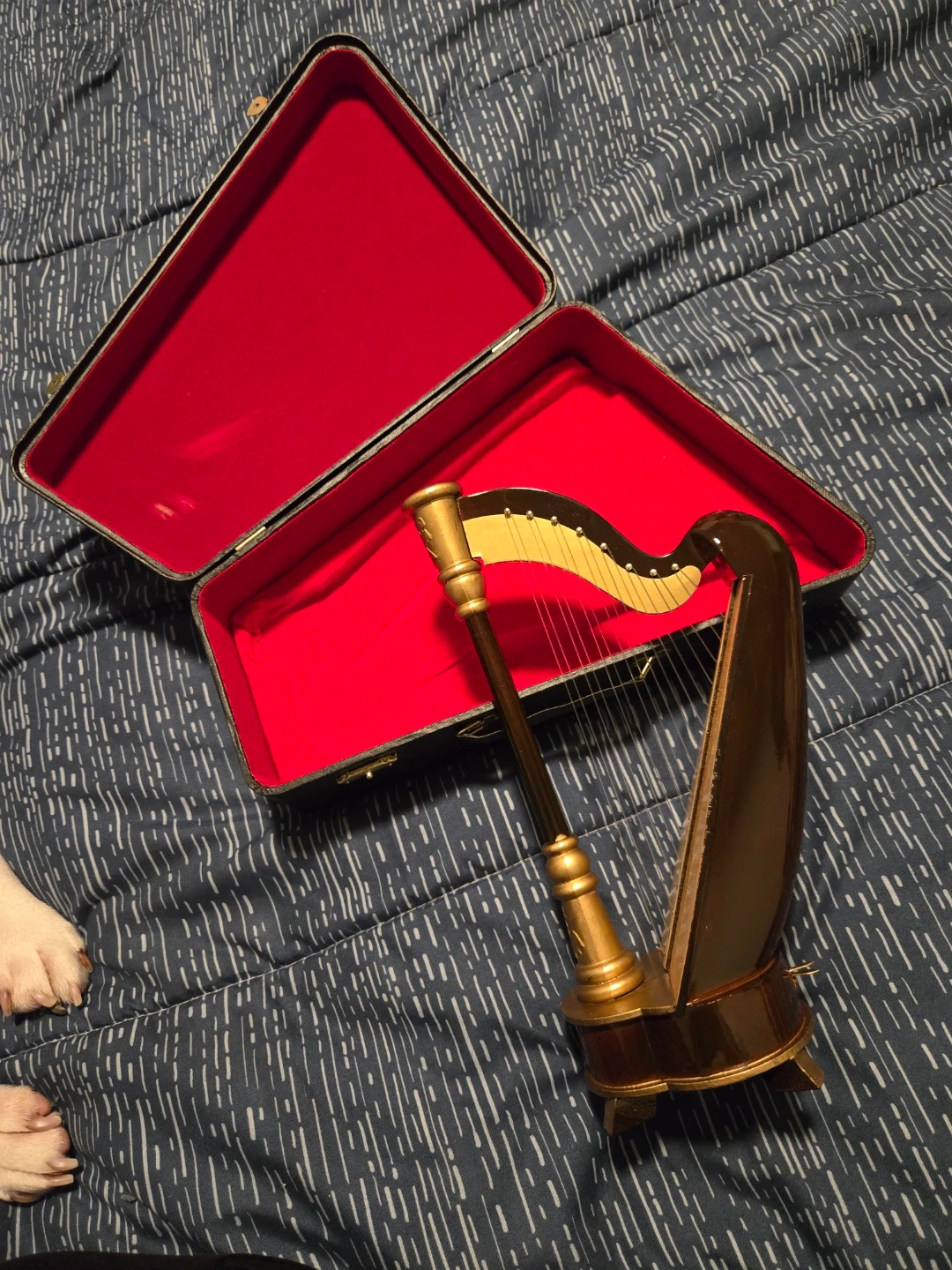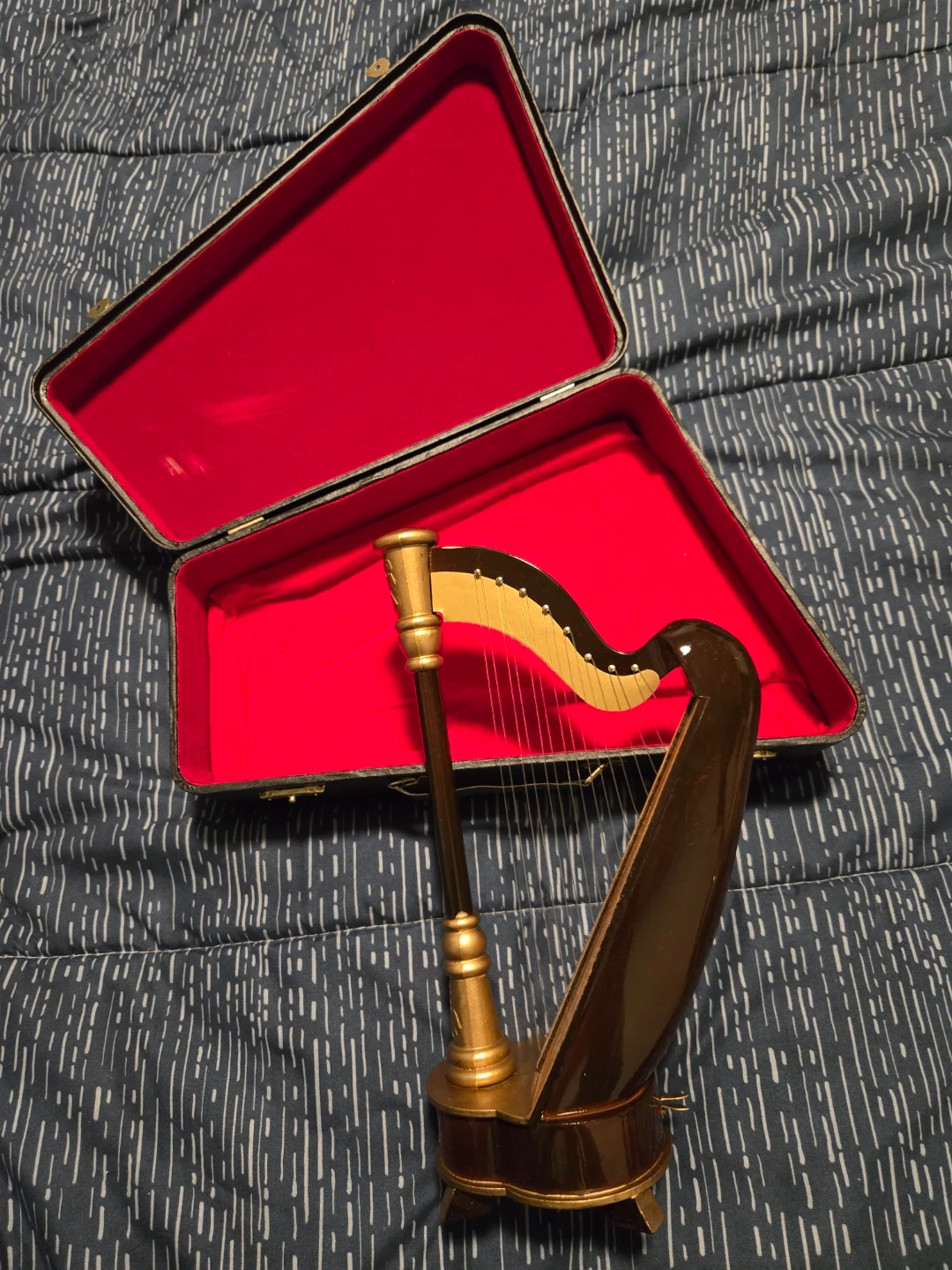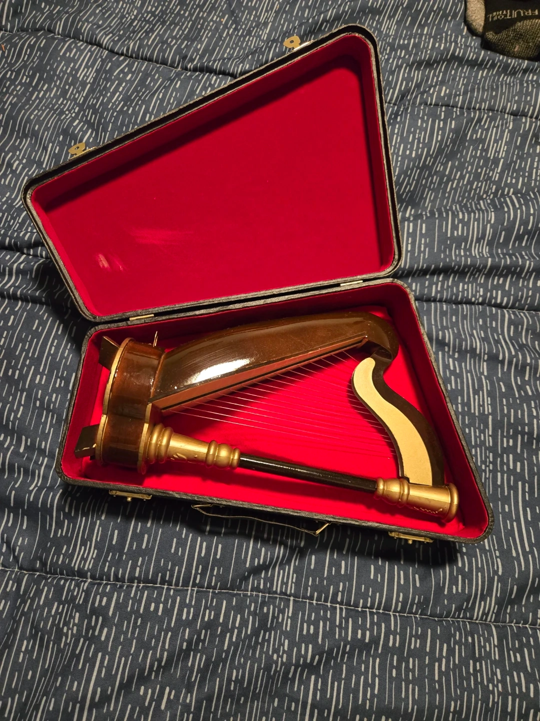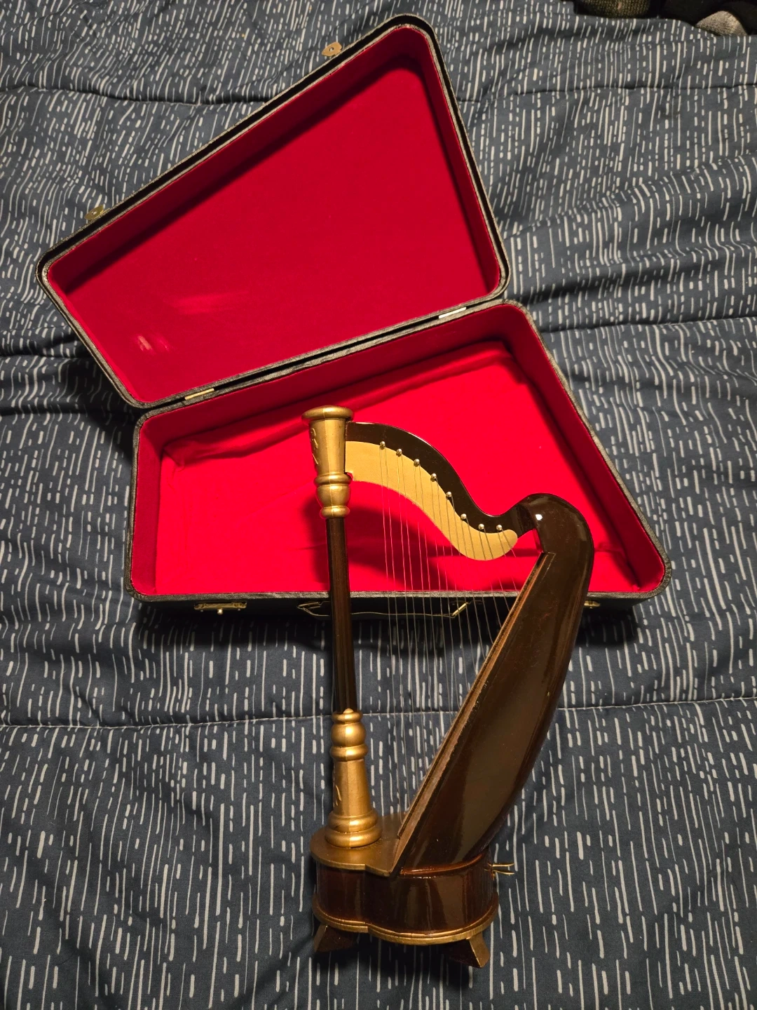 Selling a decorative mini harp that comes with its own carrying case. It's in great shape and would make a lovely addition to any room. The case is lined with red velvet, adding a touch of elegance. Perfect for collectors or anyone who appreciates unique decor. Never used as it was too big for intended use.