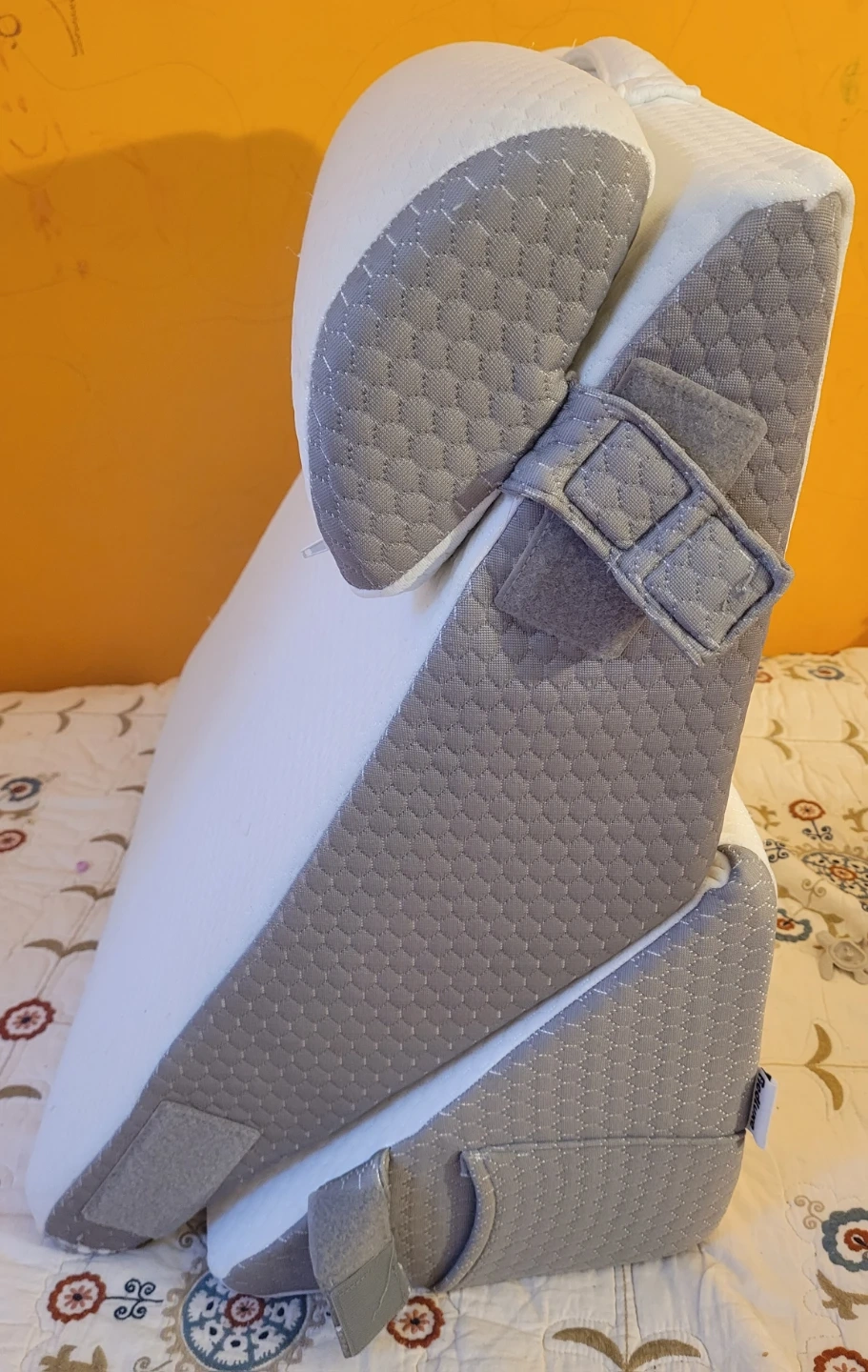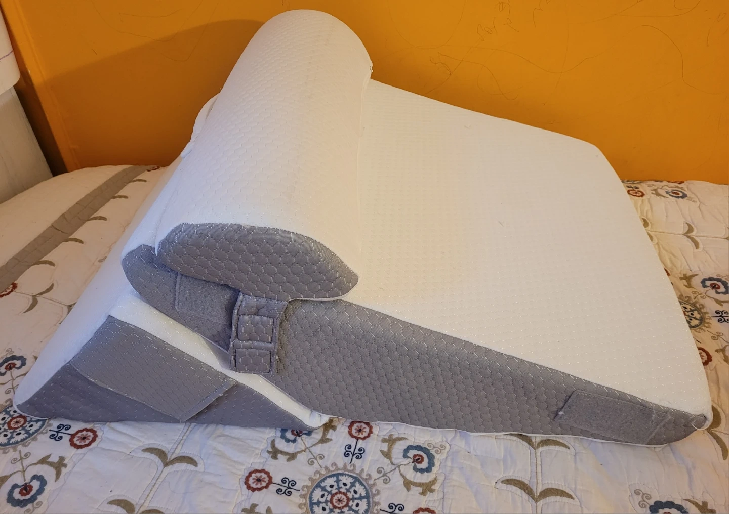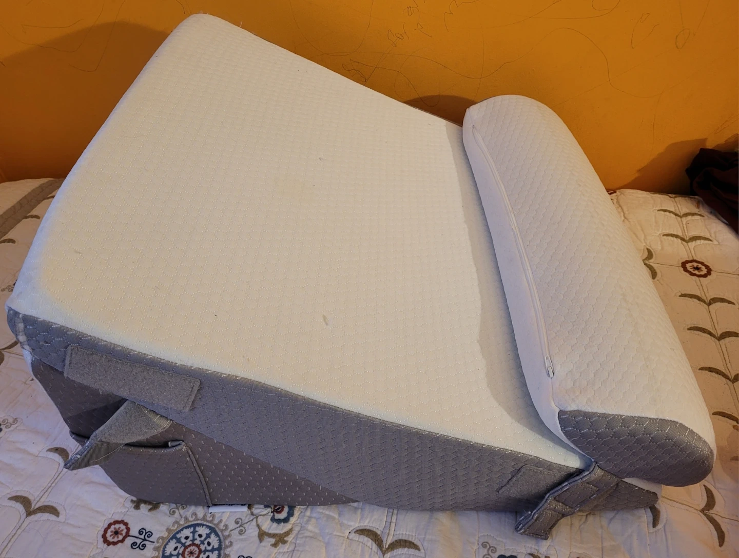 Selling an adjustable bed wedge pillow in great condition! It's white and gray and includes a cylindrical pillow for extra support. Great for elevating your head and torso while resting or sleeping