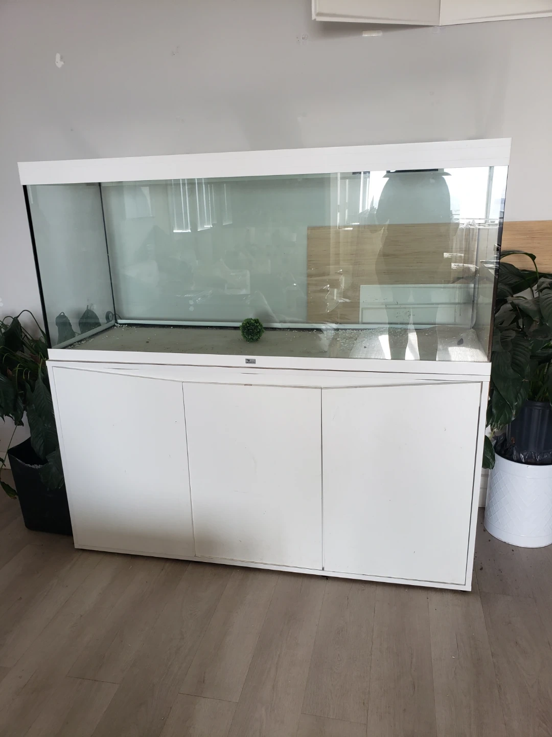 Selling a large fish tank with a white cabinet stand. It's a great setup for any fish enthusiast! The tank is quite spacious, providing ample room for your aquatic pets to swim and explore. The cabinet offers plenty of storage space for all your fish keeping supplies. It's in good condition and ready for a new home