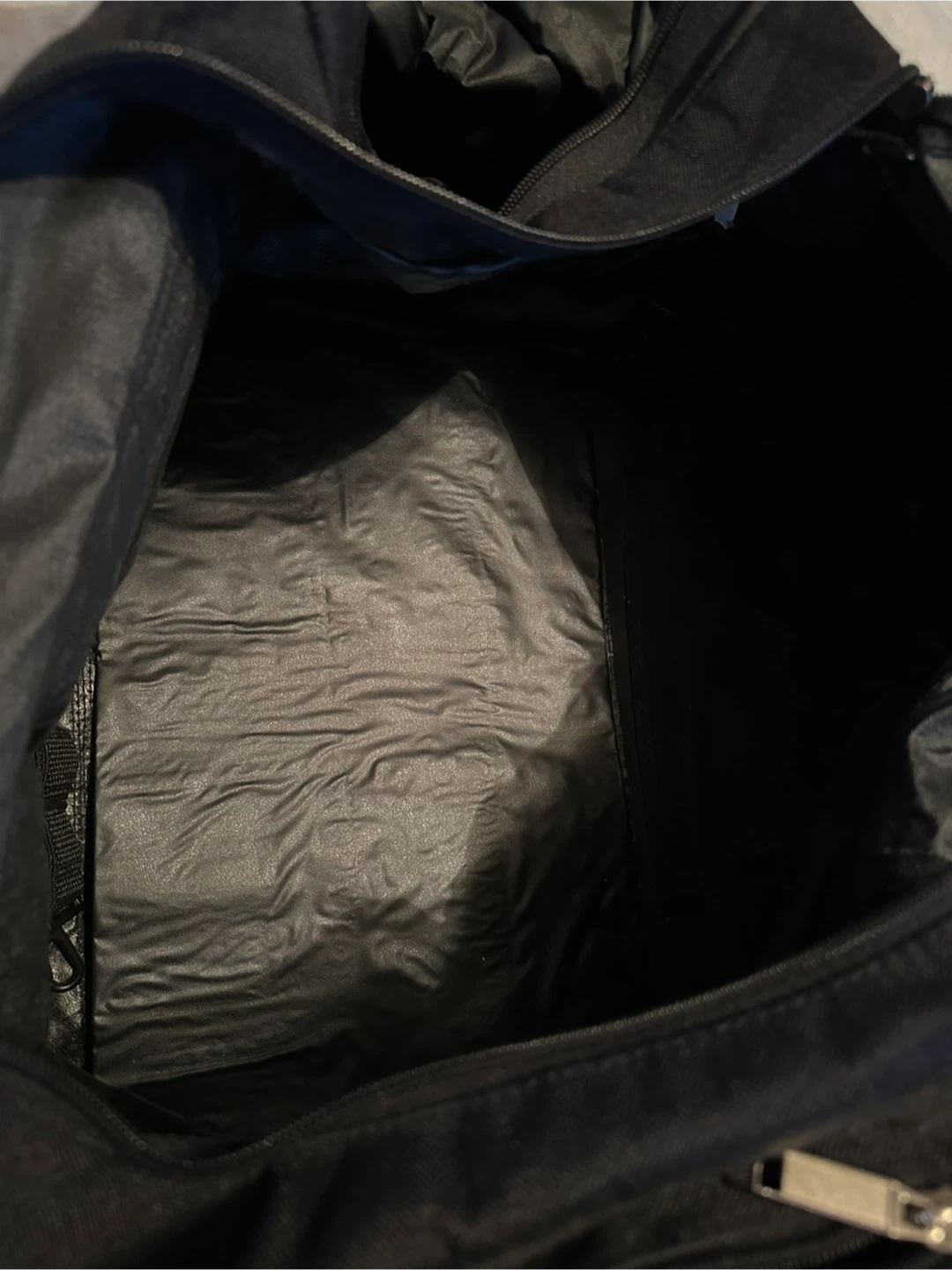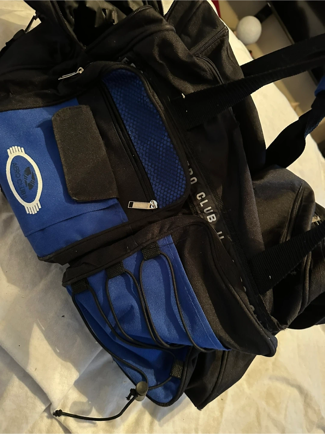 Blue and black duffel bag. It’s a good size and not heavy at all. The only damage is a small tear in the inside of one of the side pockets. Otherwise it’s like new.