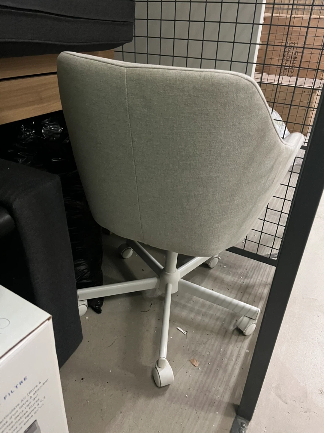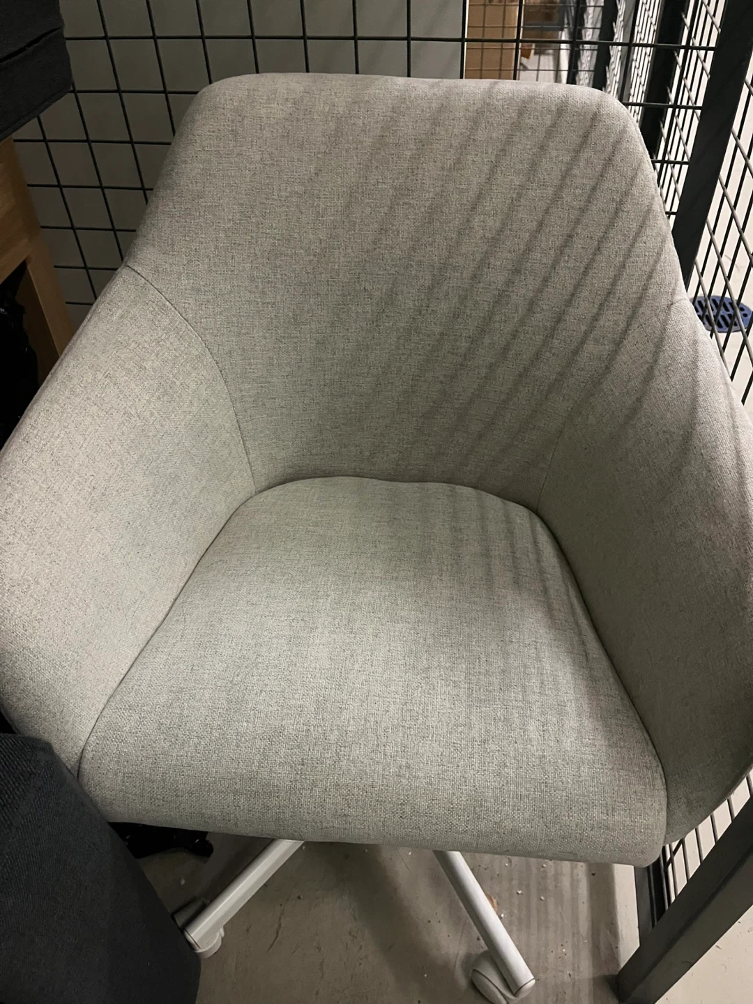 Here's a comfy light grey swivel office chair! It's in great shape and ready to add some style to your workspace. The chair features a sturdy base with smooth-rolling casters for easy movement. Perfect for home or office use!