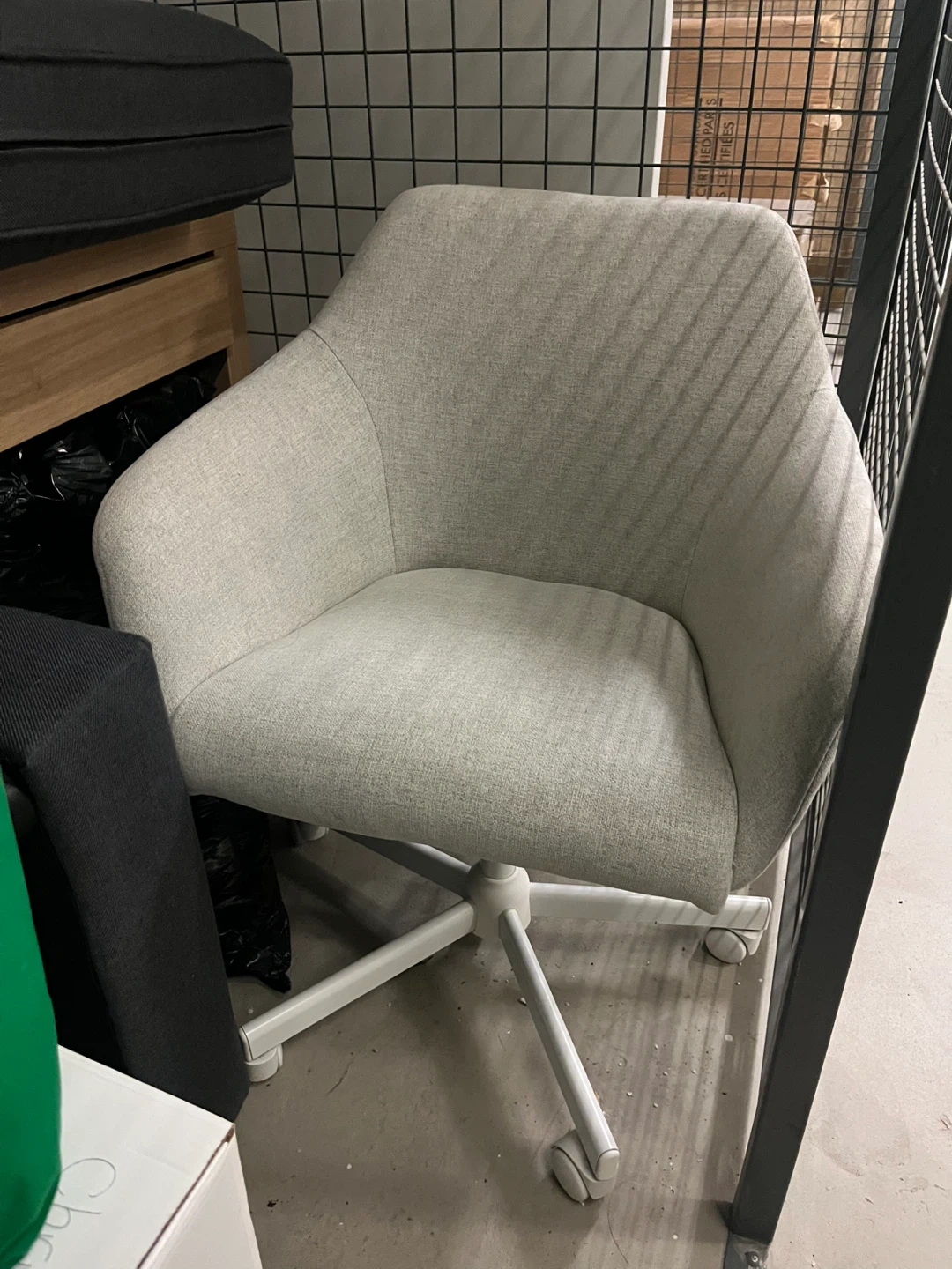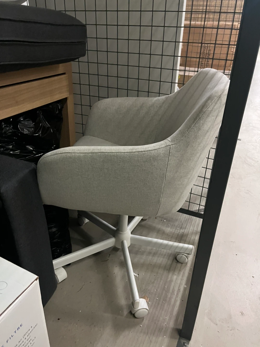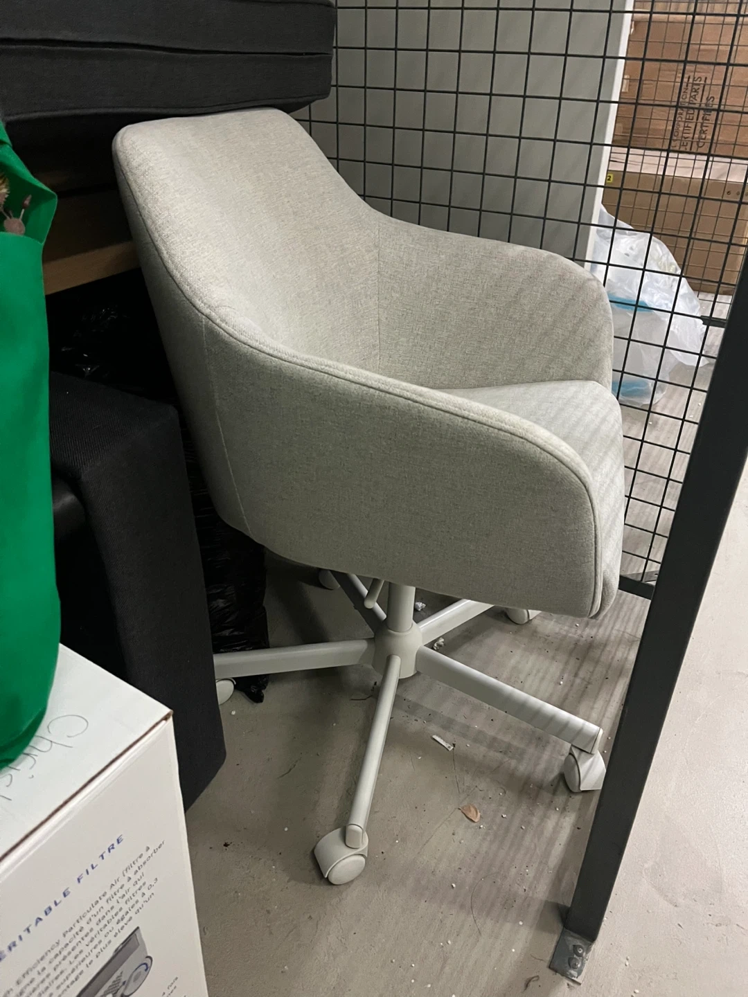 Here's a comfy light grey swivel office chair! It's in great shape and ready to add some style to your workspace. The chair features a sturdy base with smooth-rolling casters for easy movement. Perfect for home or office use!