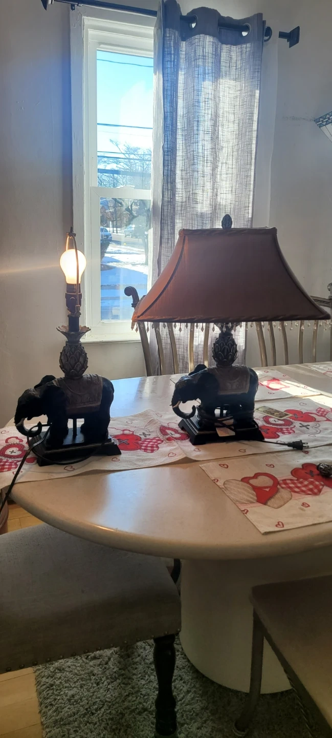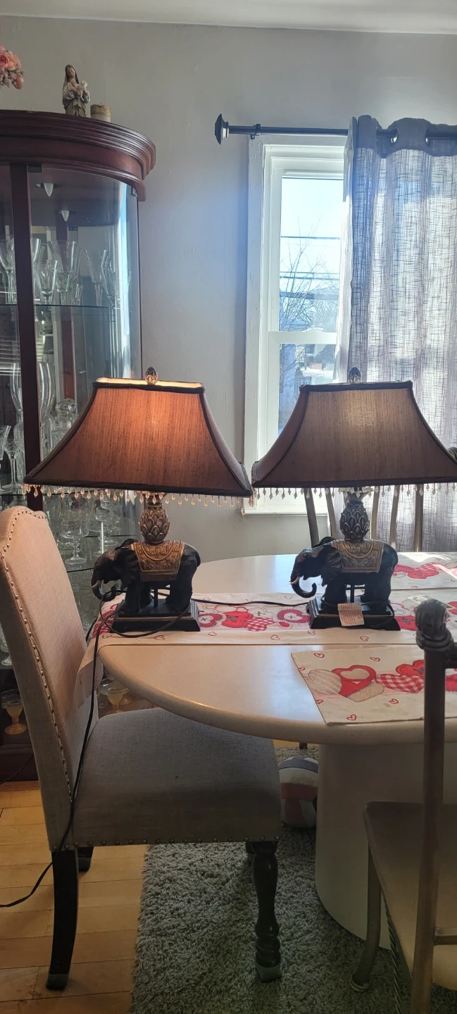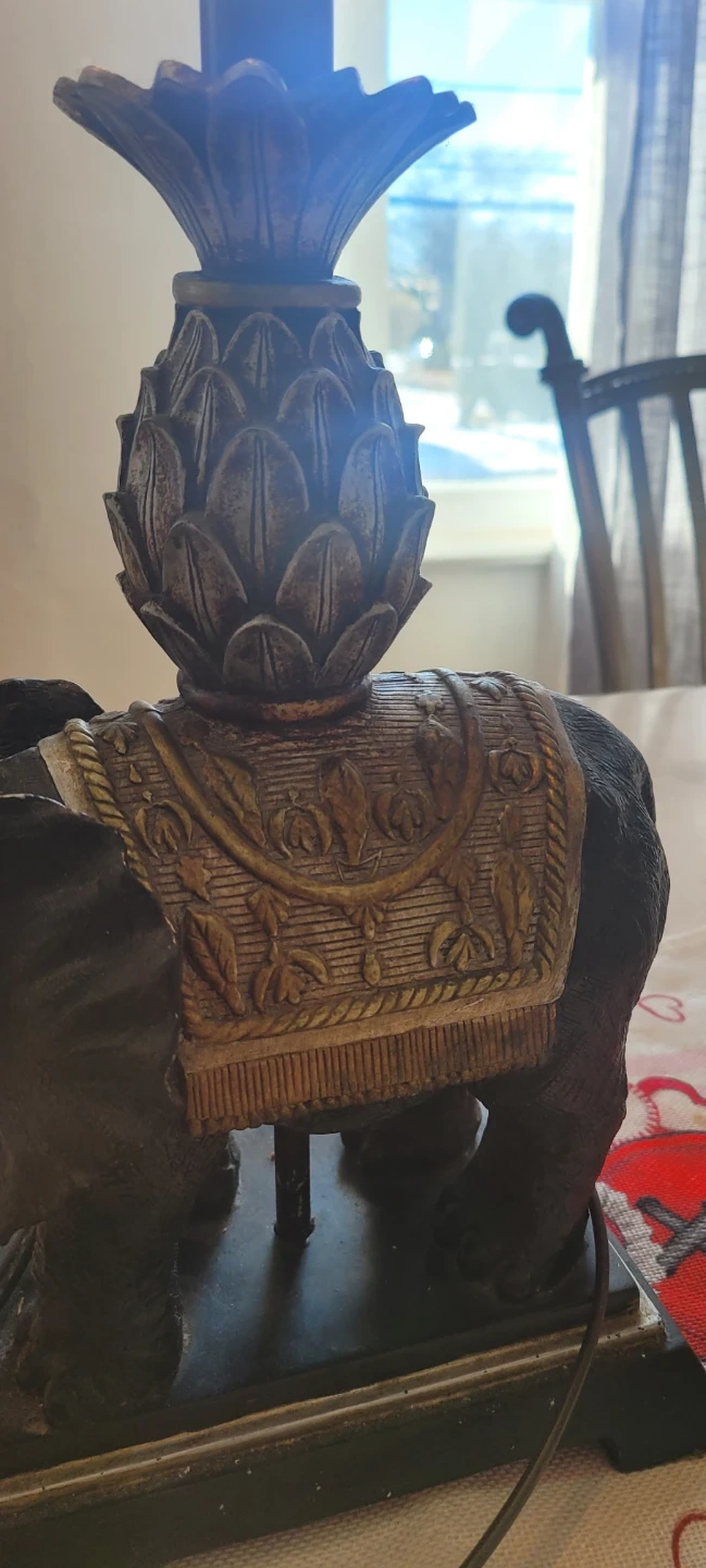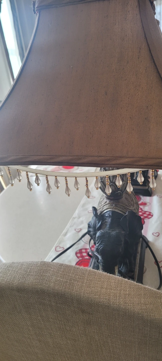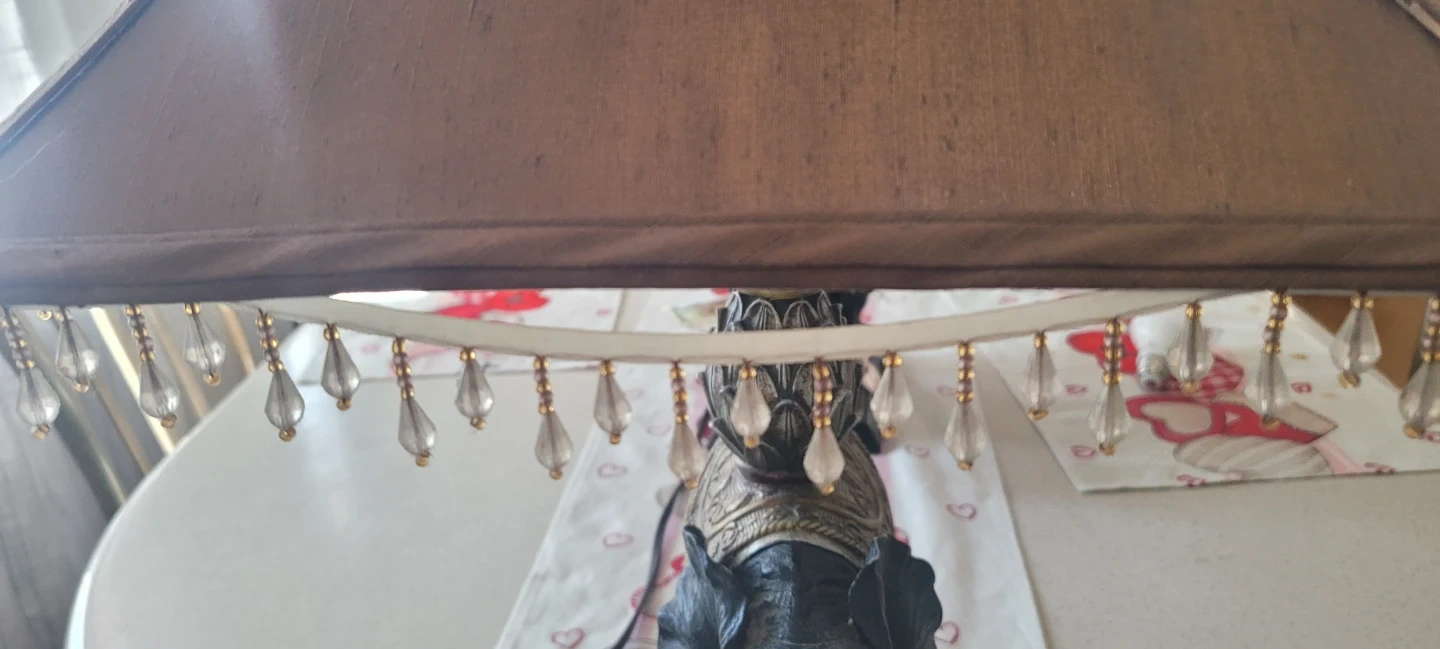 Selling an elephant table lamp with a brown shade. It features a decorative elephant base and a beaded trim on the shade. A lovely addition to any room!