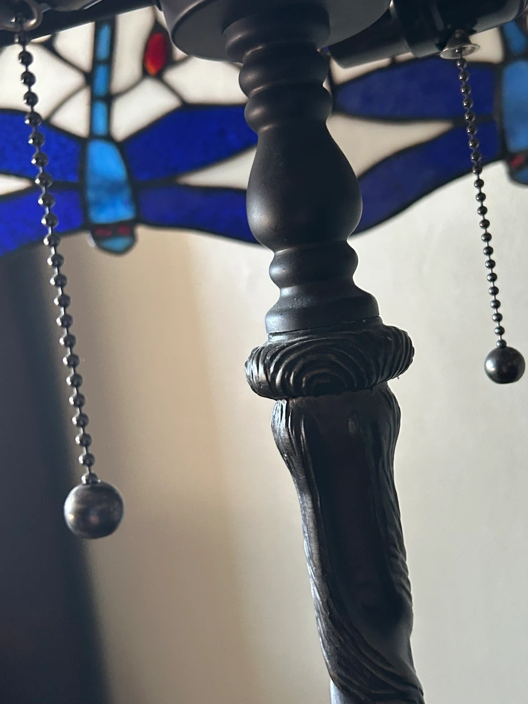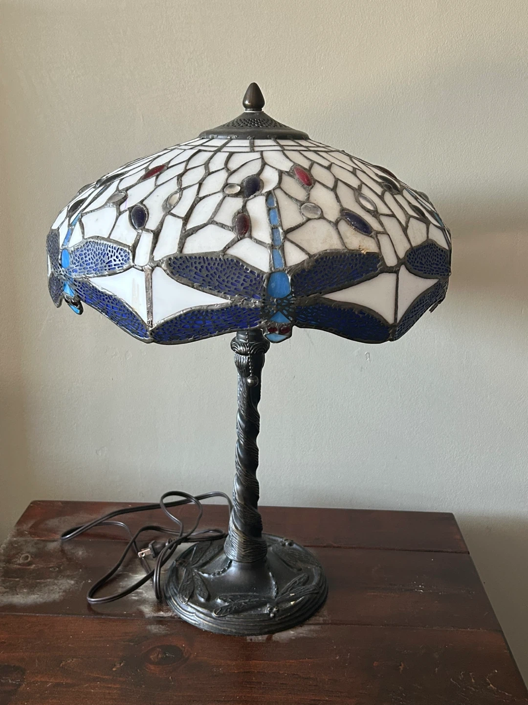 Beautiful Tiffany style table lamp featuring a dragonfly design. The base is dark metal and has a dragonfly pattern. The shade is made of stained glass in white, blue, and red tones. It will add a touch of elegance to any room!