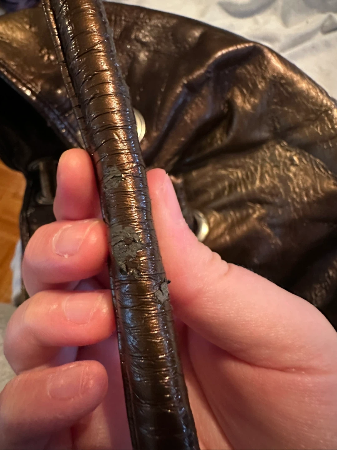 The only damage is some wear on the handles which is unfortunately because of the material the bag is made of. It’s just aging with the rubbing of the handles in the metal rings. Despite that, it’s in good condition and will have years of life left in it as long as you don’t mind the minor bits of wear. It’s really not that noticeable. I just wanted to point out that it’s there!