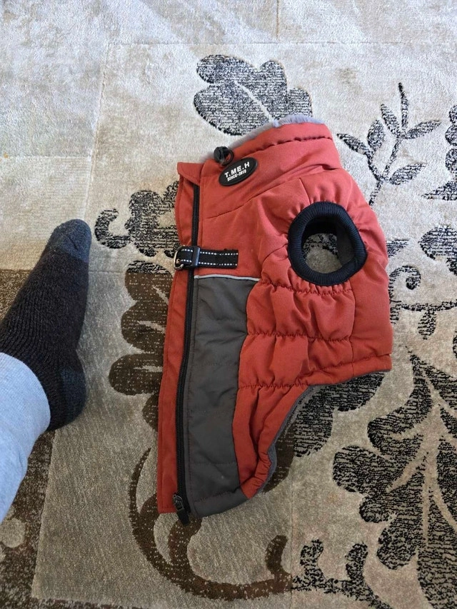 Keep your furry friend warm with this gently used T.ME.H dog/cat coat, size small, perfect for chilly Canadian weather. This coat features a cozy lining and durable outer shell to protect your pet from the elements. Available as long as posted. Payment: Cash accepted