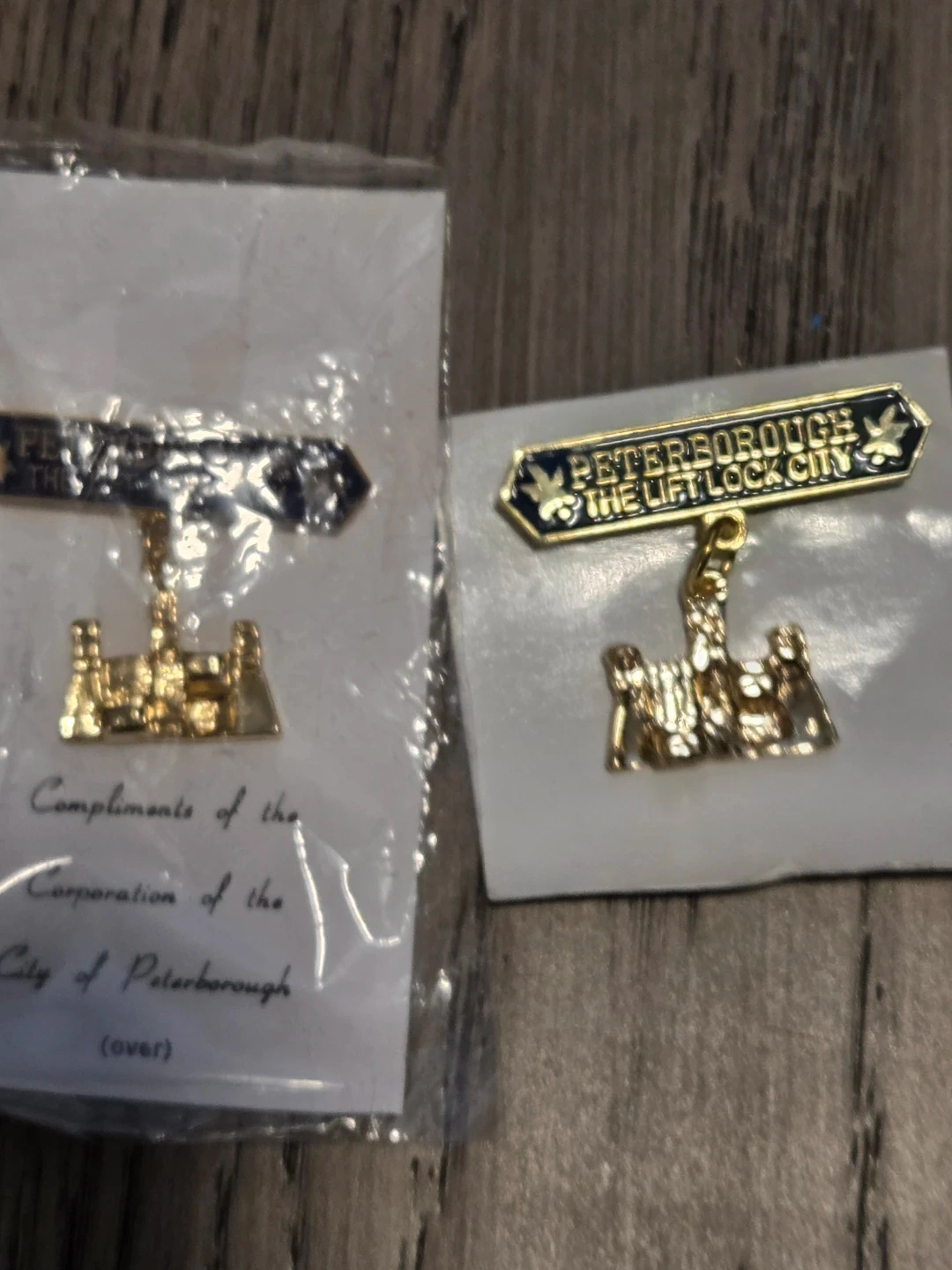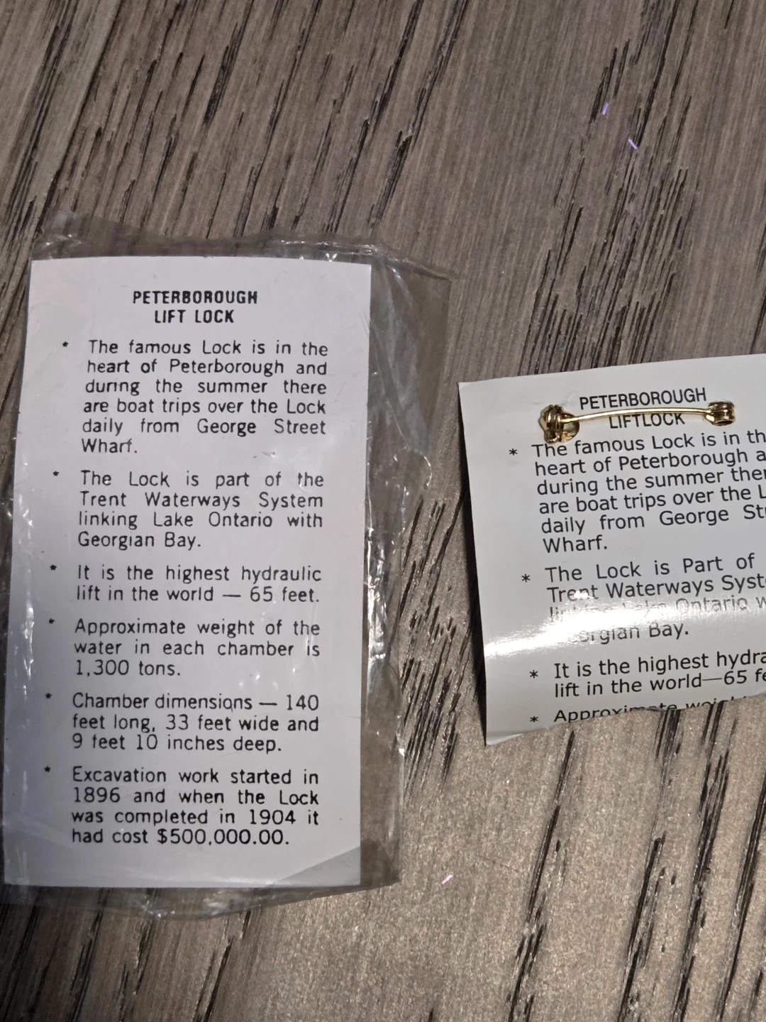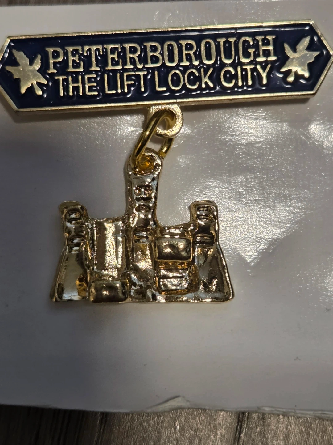 Selling 2 Peterborough Lift Lock City pins. It's a cool souvenir from Peterborough, known as the Lift Lock City! The pin shows the famous Lift Lock, a neat part of the Trent Waterways System. This hydraulic lift is the highest in the world, at 65 feet!