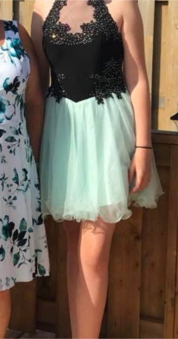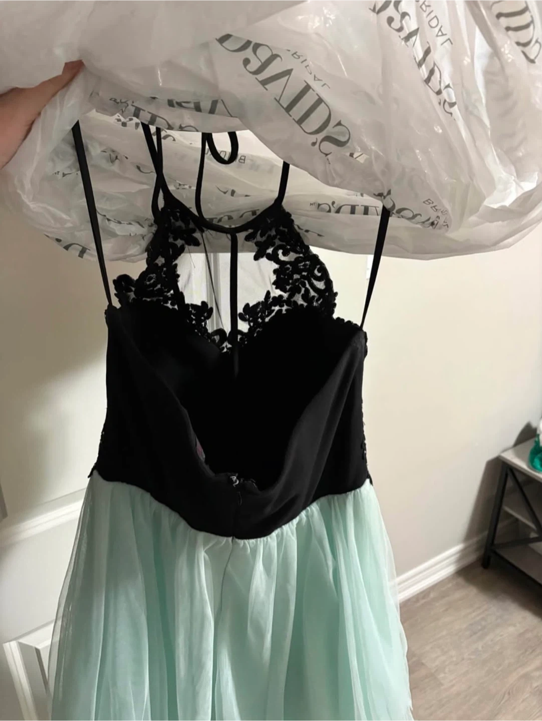 Selling a beautiful grad / prom dress. It features a black bodice with delicate lace detailing and a light turquoise tulle skirt. Perfect for prom or any special occasion!