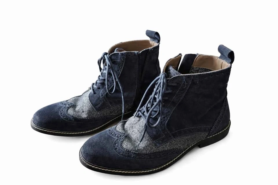 Stylish men’s ankle boots in excellent condition, only worn twice. Navy suede with gray herringbone tweed detailing and classic brogue perforation. Lace-up front with side zipper for easy on/off. Clean interiors and minimal sole wear.