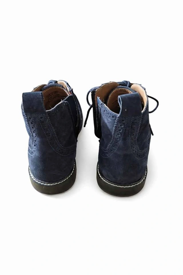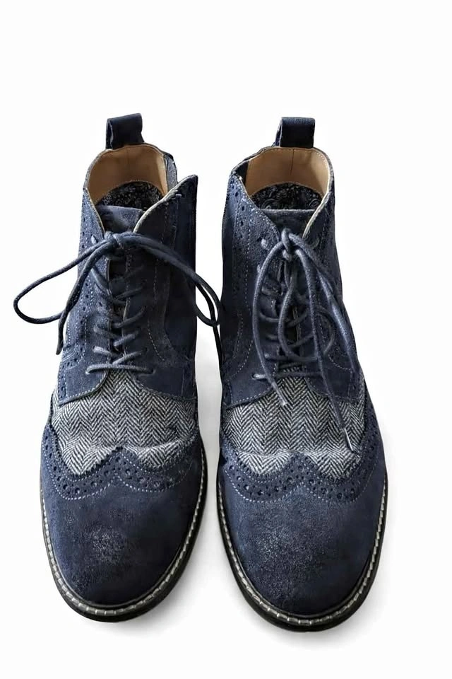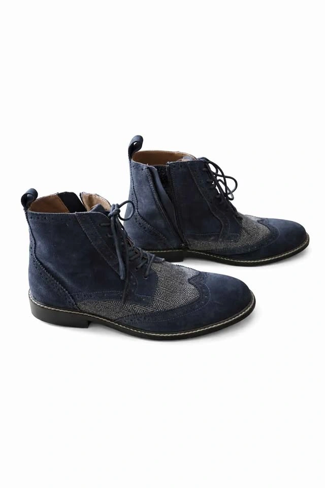 Stylish men’s ankle boots in excellent condition, only worn twice. Navy suede with gray herringbone tweed detailing and classic brogue perforation. Lace-up front with side zipper for easy on/off. Clean interiors and minimal sole wear.