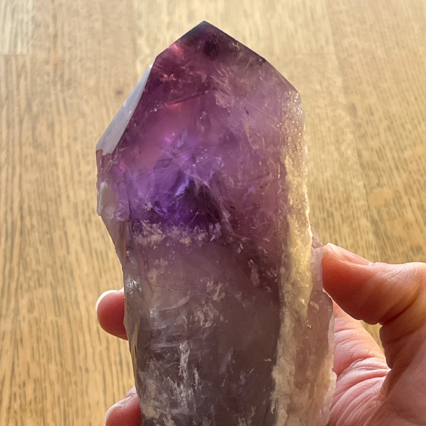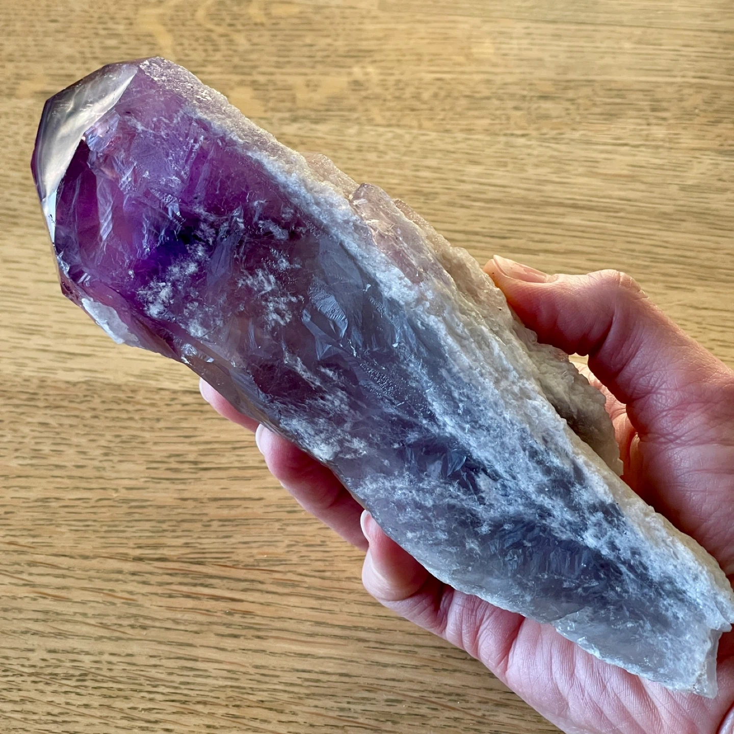An amethyst scepter, or "torch" crystal, is a unique formation where a larger amethyst grows atop a smaller one, amplifying the stone's natural healing and protective energies for focused spiritual work, meditation, and channeling higher consciousness.