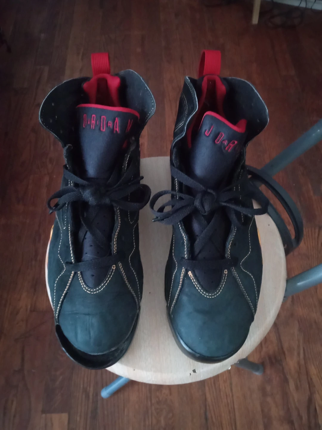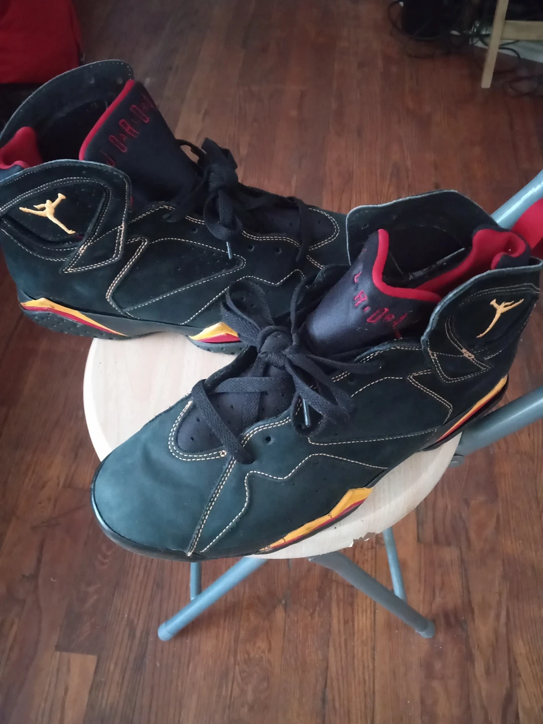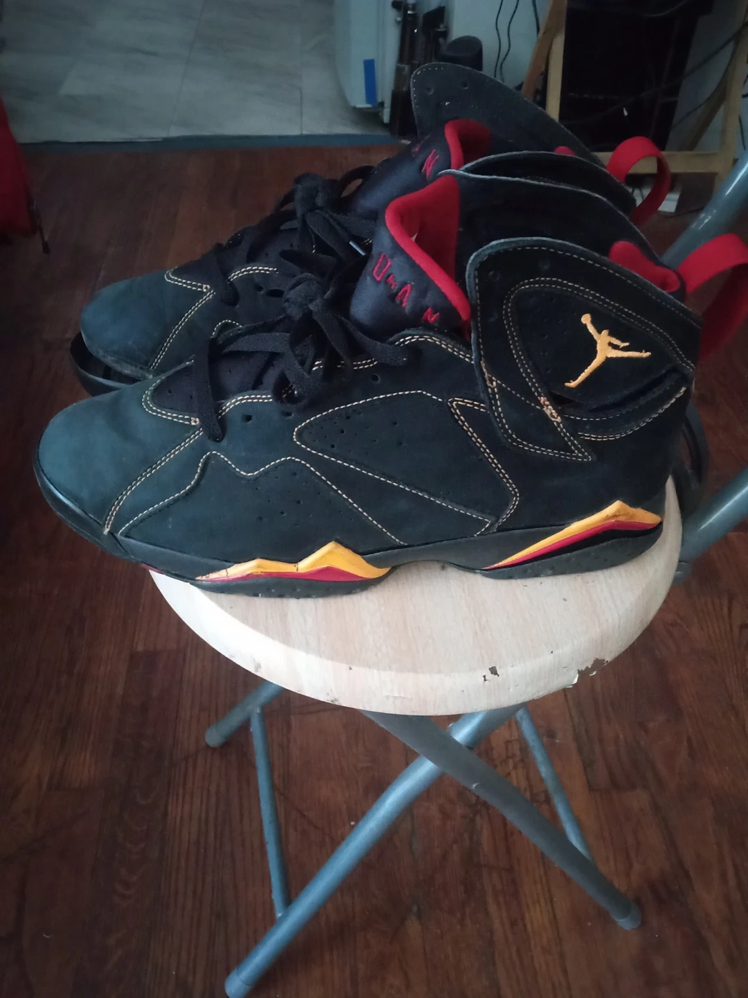 Selling a pair of Collectible Air Jordan 7 citrus Retro sneakers in black and red. They're in good condition with some signs of wear, as shown in the pictures. These are a classic and stylish addition to any sneaker collection!