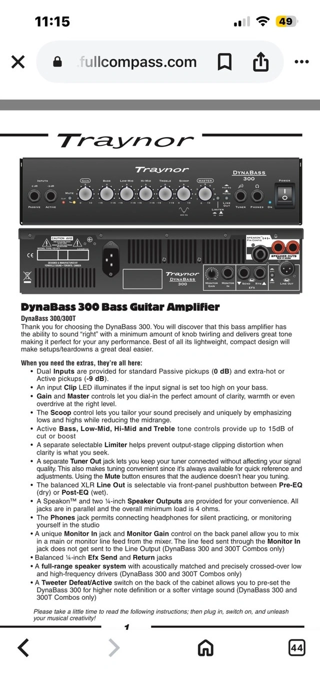 For sale is a Traynor DynaBass 300 combo amplifier, perfect for bassists seeking a powerful and versatile sound solution. This used amp delivers a robust 300 watts of power, ensuring it can handle practice sessions and live performances with ease. Its compact design doesn't compromise on sound quality, offering a range of tonal options to suit various musical styles. The condition shows some signs of use, but it functions perfectly, ready to amplify your bass lines. * 300 Watts of Power * 15-inch Speaker * 7-Band Graphic EQ * Built-in Limiter * Headphone Jack for silent practice * Line Out Snatch up this Traynor amp, and you'll be grooving in no time. Just a friendly reminder that if the ad is up, the amp is still available, so no need to ask!