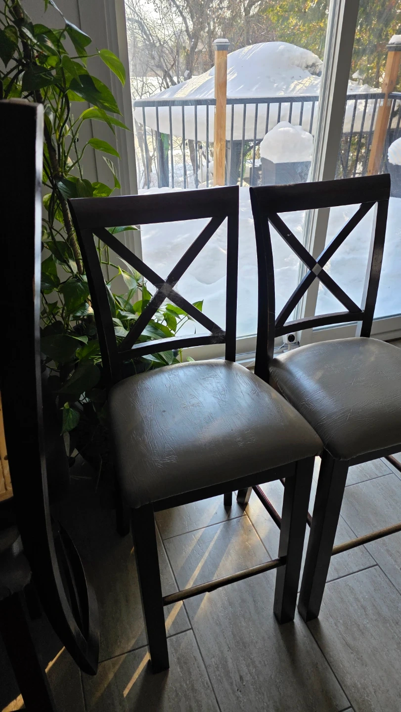 Selling a set of 4 bar stools! They feature a classic design with dark brown wooden frames and neutral-toned seats. Perfect for adding extra seating to your kitchen island or bar area. Some wood glue to reinforce some areas should do the trick!