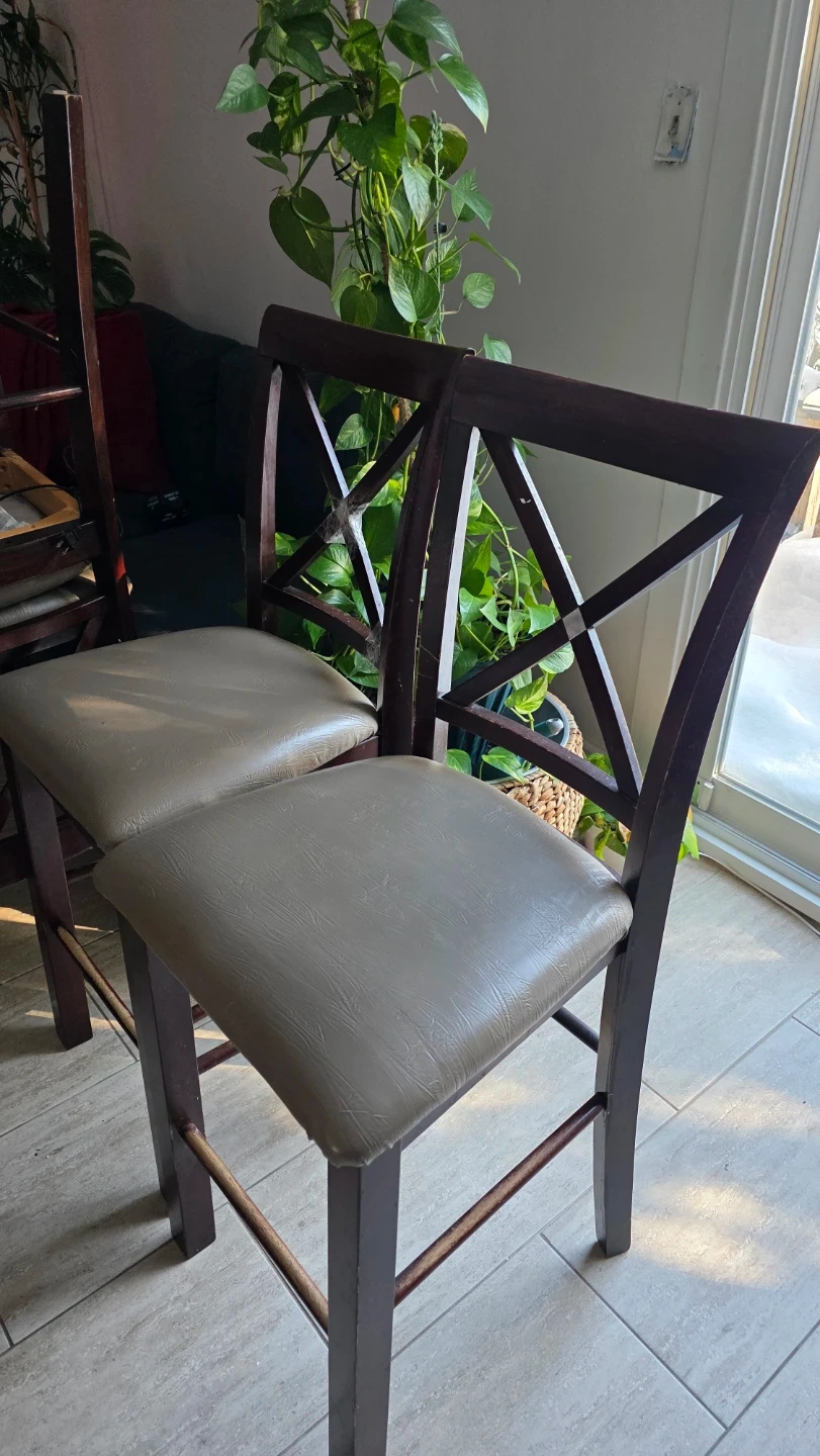 Selling a set of 4 bar stools! They feature a classic design with dark brown wooden frames and neutral-toned seats. Perfect for adding extra seating to your kitchen island or bar area. Some wood glue to reinforce some areas should do the trick!