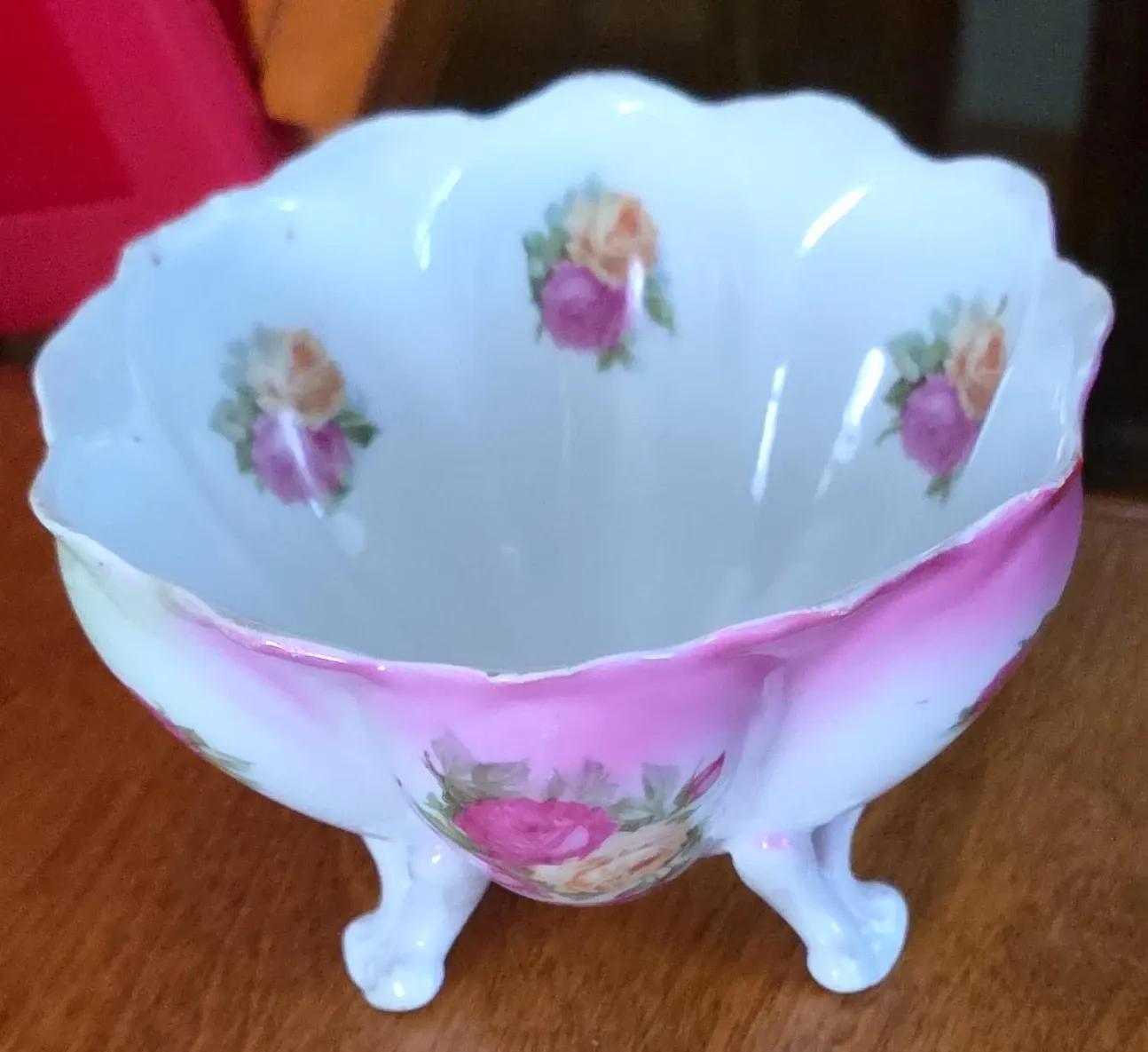 This is a beautiful vintage bowl with a delicate floral pattern. It features a lovely pink accent around the rim and stands on three little feet. Perfect for adding a touch of vintage charm to your home!