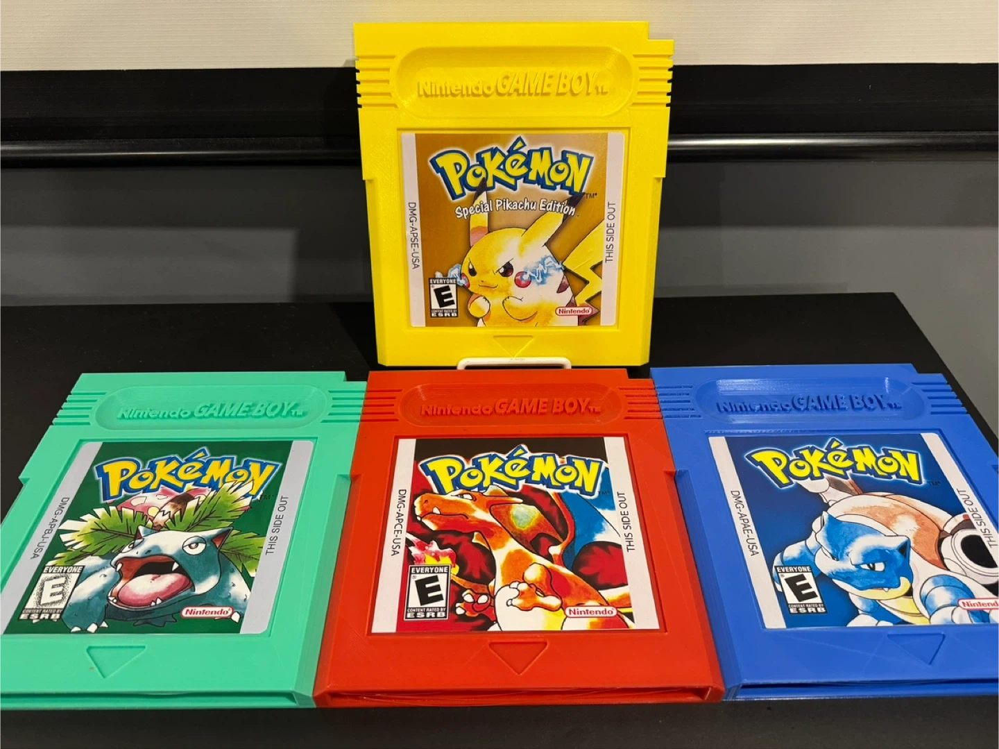 Selling a set of four or individual wall arts replicating your Pokémon Game Boy cartridges! These are 3D printed and come in the colours matching the original game cartridges: yellow (Pikachu), red (Charizard), green (Venusaur), and blue (Blastoise). Perfect for showing off your collection!