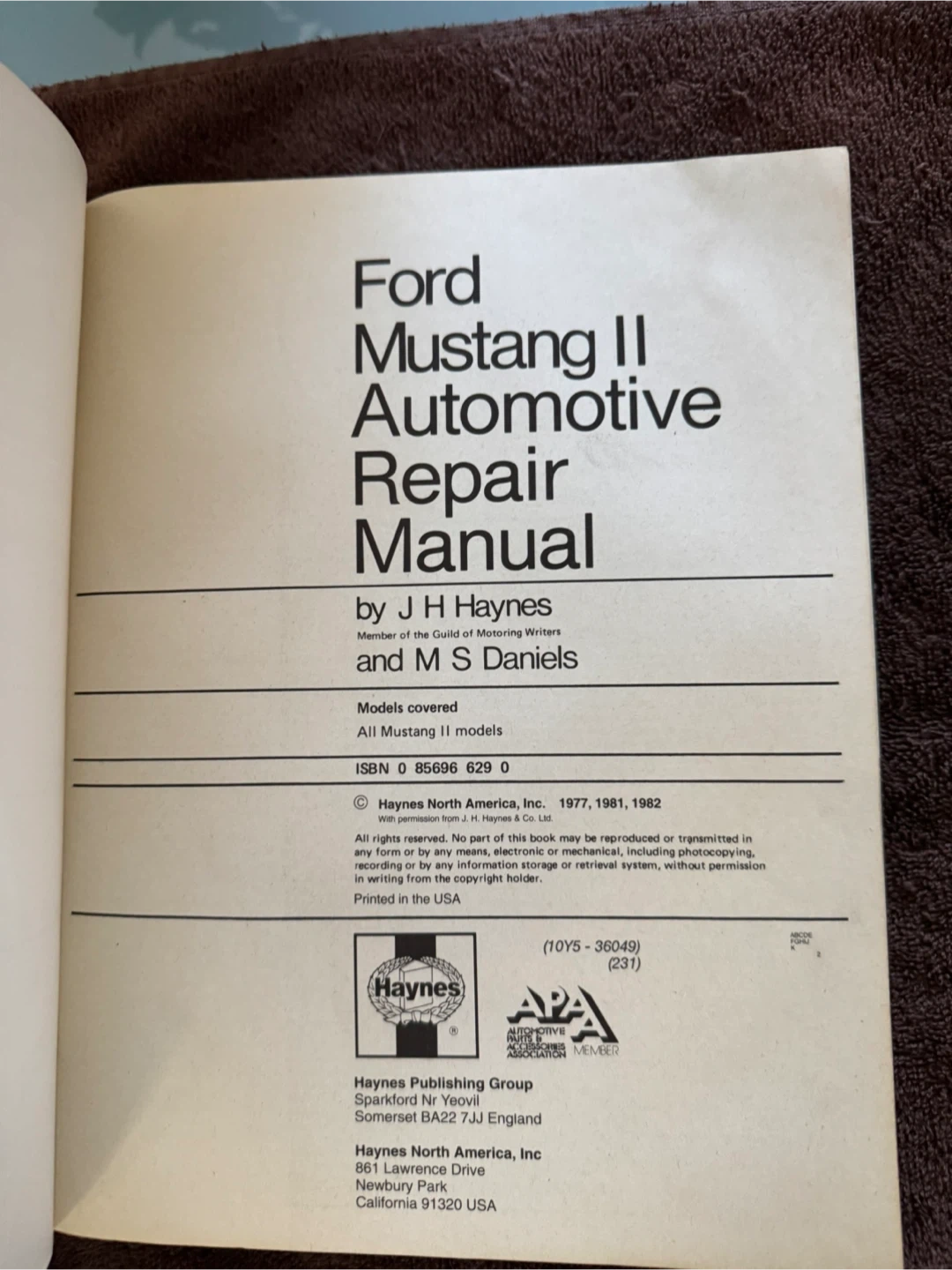 I'm selling a Ford Mustang II Automotive Repair Manual by J H Haynes and M S Daniels. Models covered are All Mustang II models. The manual covers models from 1974 thru 1978, including 140, 171 and 302-cu in (2.3, 2.8 and 5 liters).