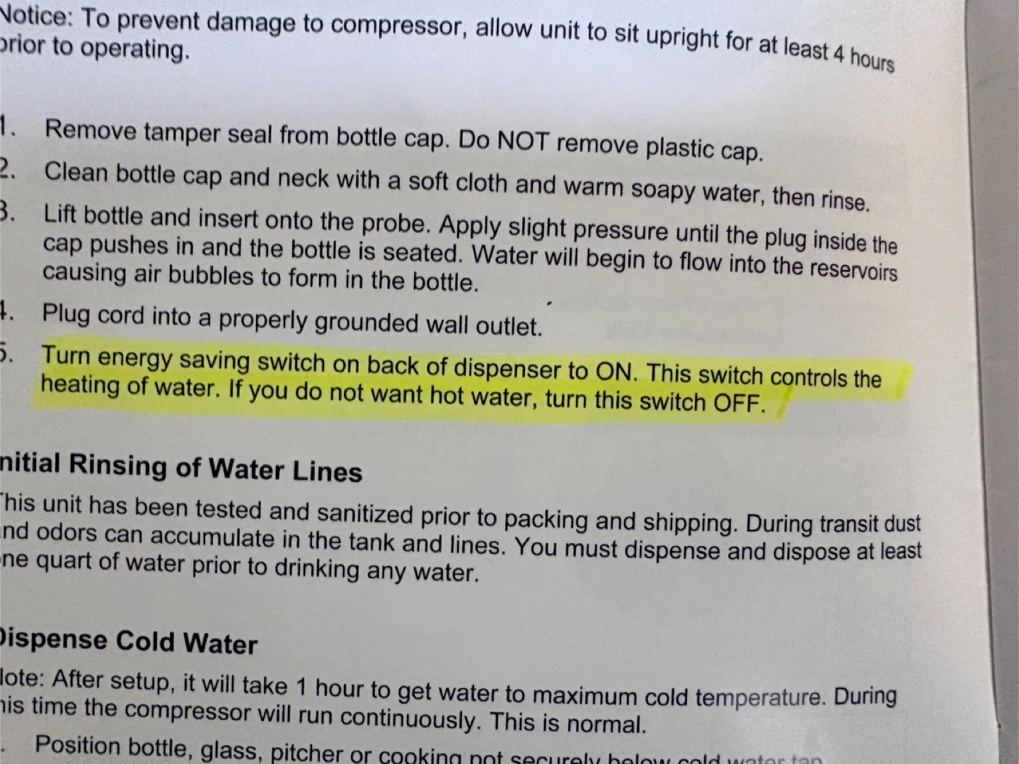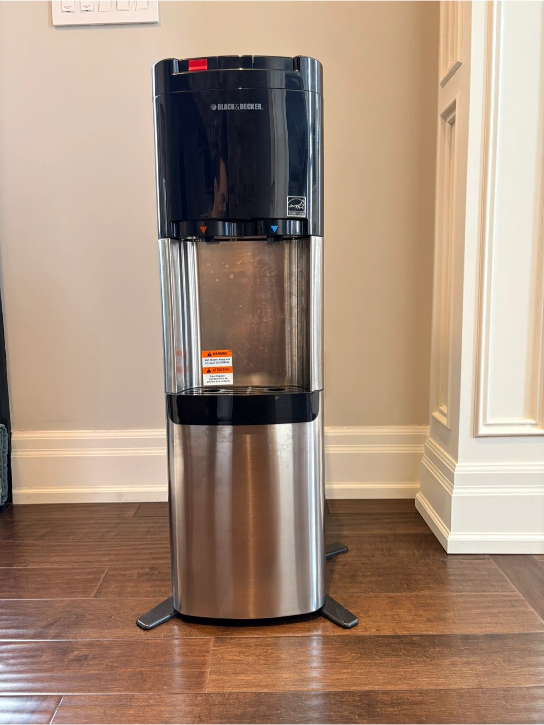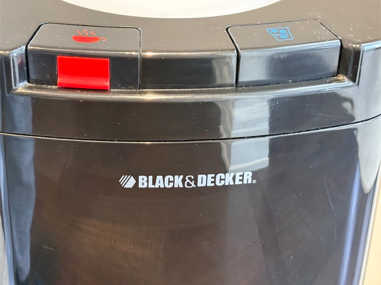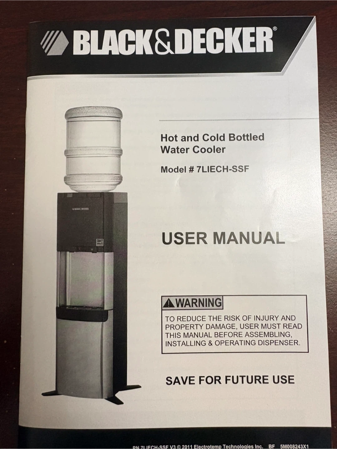 Black & Decker water dispenser. It offers both hot and cold water options, perfect for any time of year! It's Energy Star certified. Black and stainless steel. Has removable drip tray. Can be used at home, office, at the business or just in the garage. It has a switch on the back to switch off heating of the water when not in use. Quiet and low energy. User Manual available.