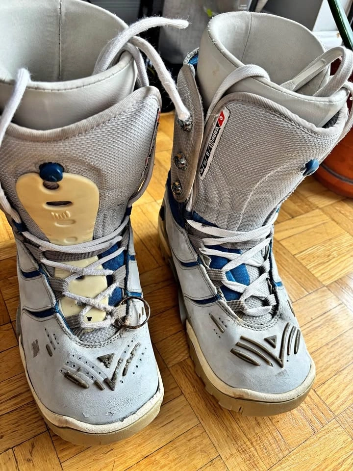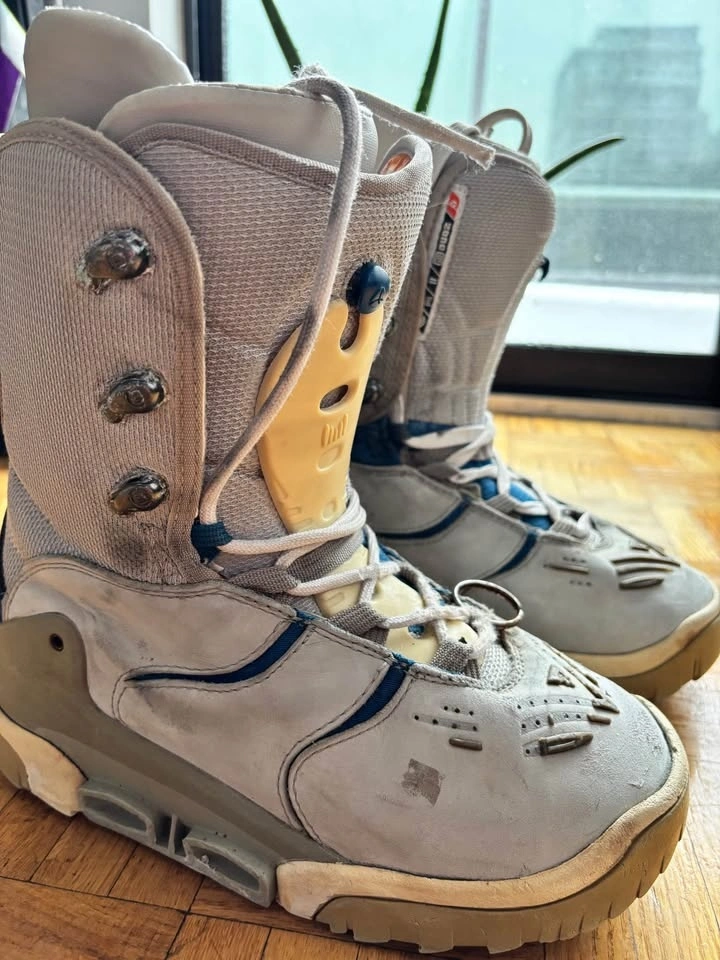 Women’s Size 8 Burton snowboard boots. Warm and comfortable and perfectly waterproof even though it looks a bit beaten up. The laces are rather long. It’s on the wide side so can work for men/youth too.