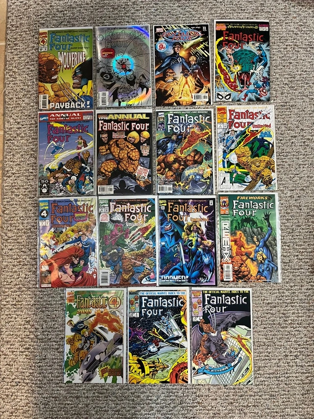 For sale is a lot of Fantastic Four Comic Books. There are 31 comics in this lot. Most are high grade. Lots of good stuff here. Issue numbers are: Vol 1 263, 288-290, 335-337, 347-350, 362, 363, 371, 375, 376, 395, 400, 489. Annual 22, 24 FF Annual 1998 Fantastic Four 1 (1996) Fantastic Four Unlimited 1-3, 8 Fantastic Four Remix 1 Fantastic Four 2099 1 Fantastic Four Official Marvel Index 5, 8