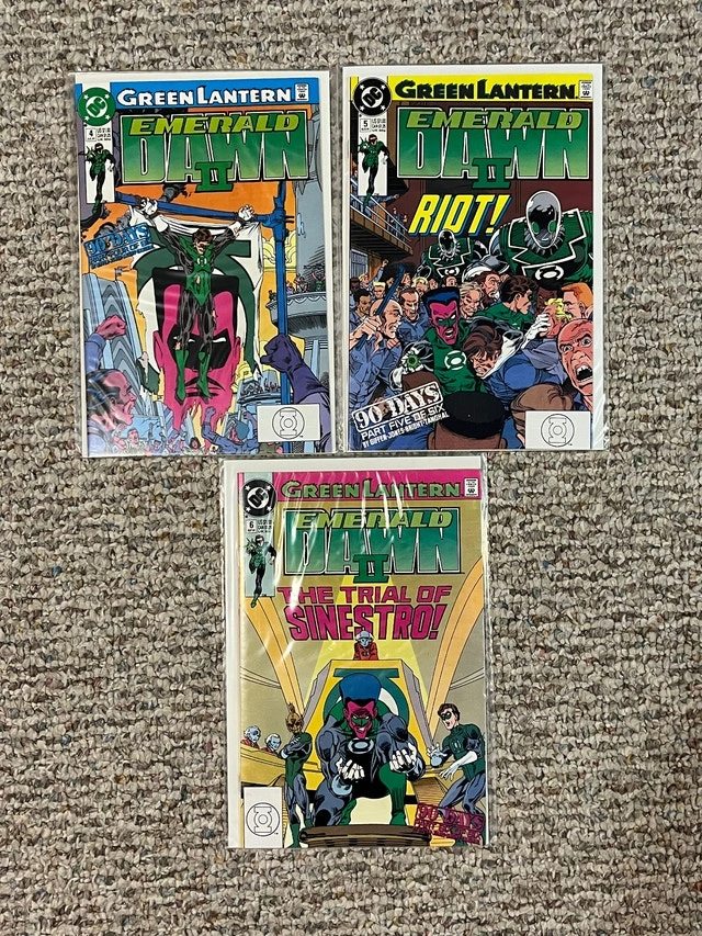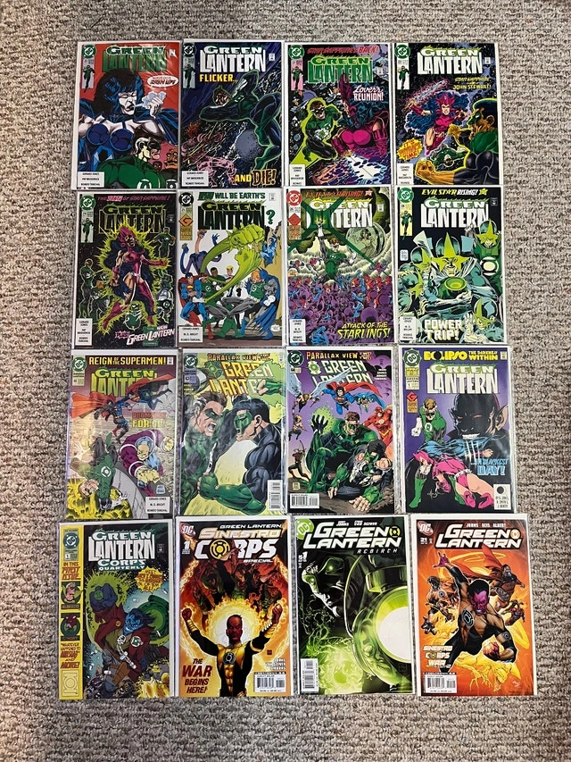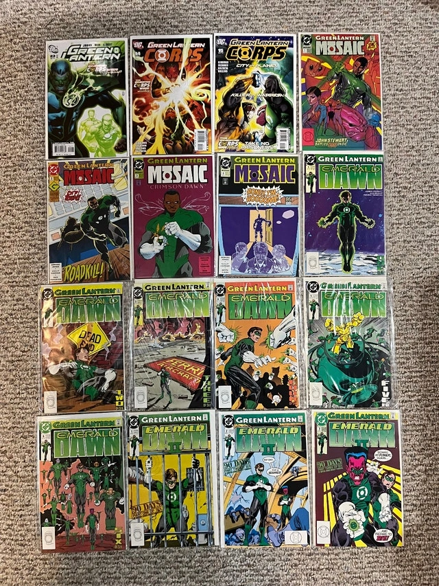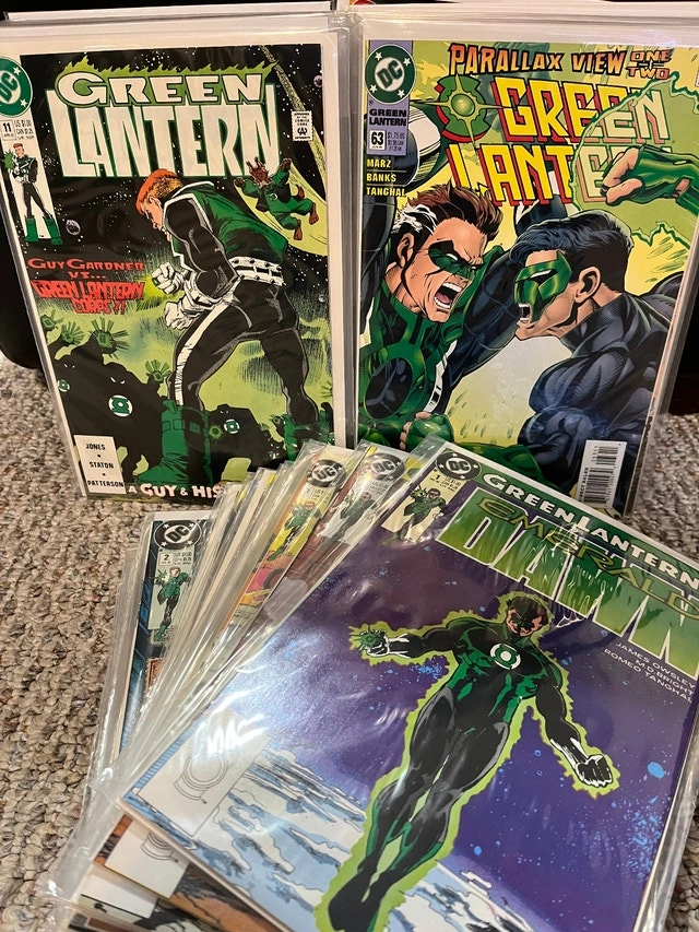 For sale is a huge lot of Green Lantern Comic Books. There are 51 comics in this lot. Most are high grade. Lots of good stuff here. Issue numbers are: Green Lantern (1990) 2-16, 19-26, 28, 46, 63, 64 Annual 1 Green Lantern Corps Quarterly 1 Sinestro Corps Special 1 Green Lantern (2004) 1 Green Lantern (2005) 21, 22 Green Lantern Corps (2007) 14, 15 Green Lantern Mosaic 1-4 Green Lantern Emerald Dawn 1-6 Green Lantern Emerald Dawn II 1-6 Cash only. Pickup is in Etobicoke, near Queensway and Islington.