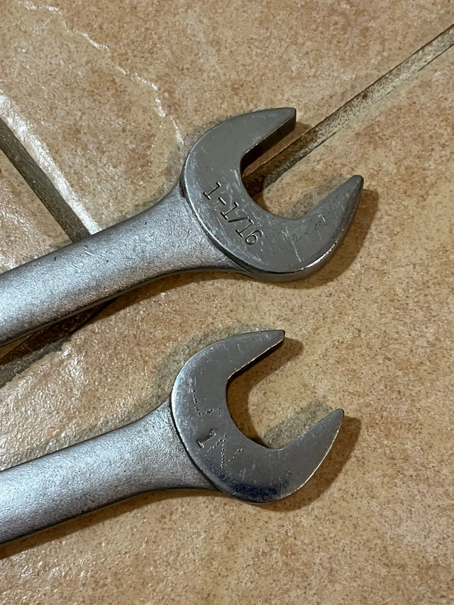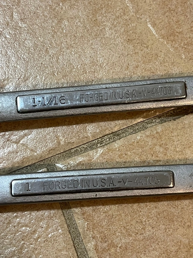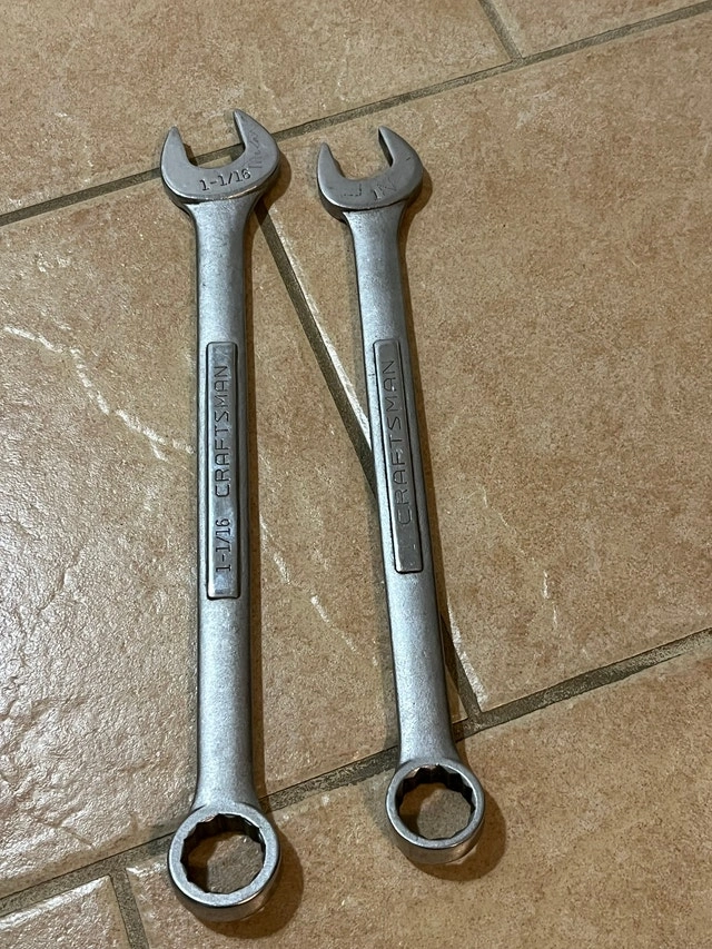 For sale is a great pair of Craftsman 1" and 1-1/16" Combination Wrenches, Made in the USA - 44706 and 44705. I have a lot more tools, especially for machinists. Please click on my name in the ad to see the other listings. Cash only. Pickup is in Etobicoke, near Queensway and Islington.
