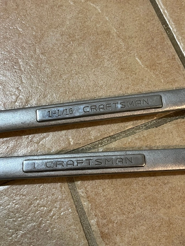 For sale is a great pair of Craftsman 1" and 1-1/16" Combination Wrenches, Made in the USA - 44706 and 44705. I have a lot more tools, especially for machinists. Please click on my name in the ad to see the other listings. Cash only. Pickup is in Etobicoke, near Queensway and Islington.