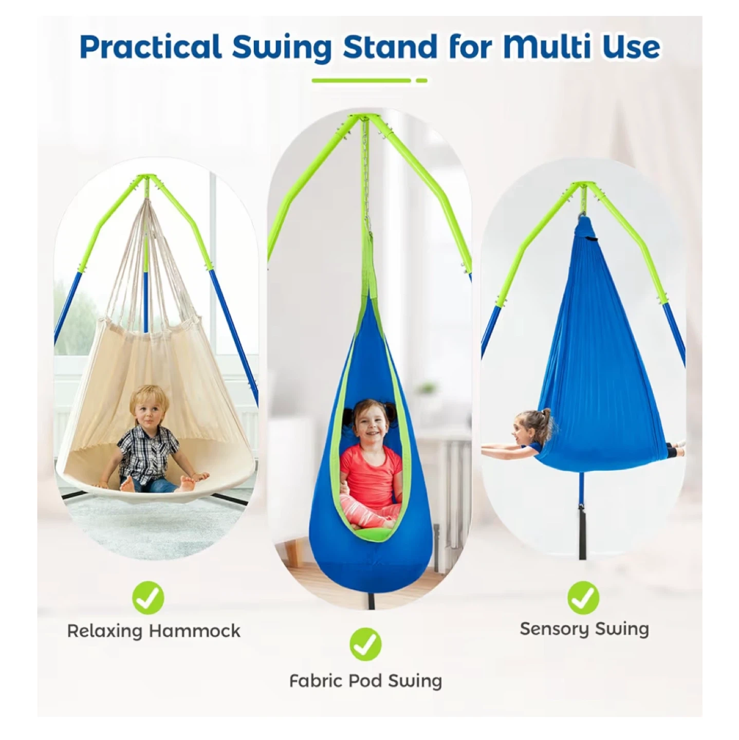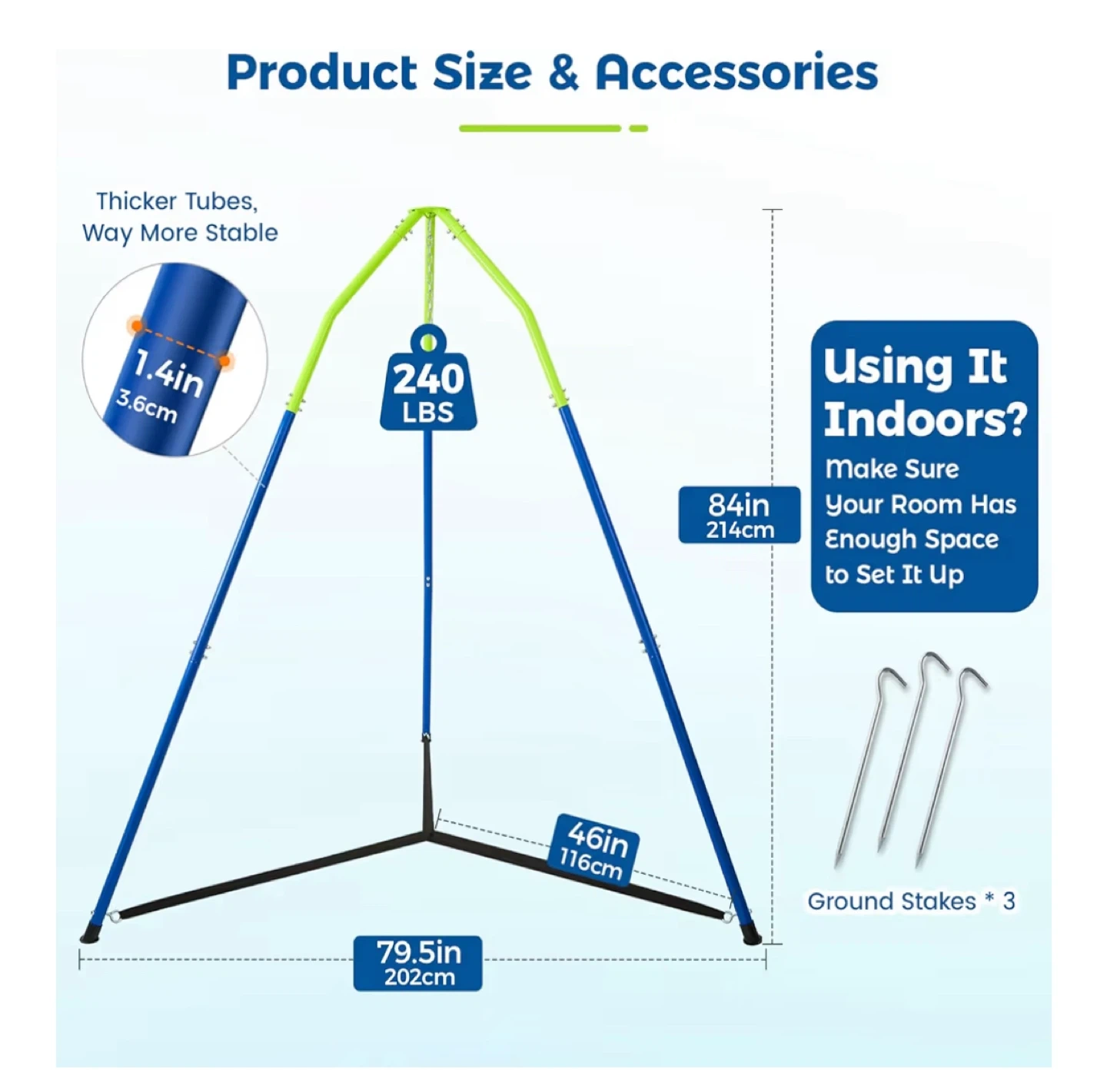 This swing stand is perfect for both indoor and outdoor use! It measures 84 inches (214cm) in height and comes with ground stakes for extra outdoor stability. The tubes are 1.4 inches (3.6cm) thick, making it very stable. It can also be used with a relaxing hammock, fabric pod swing, or sensory swing