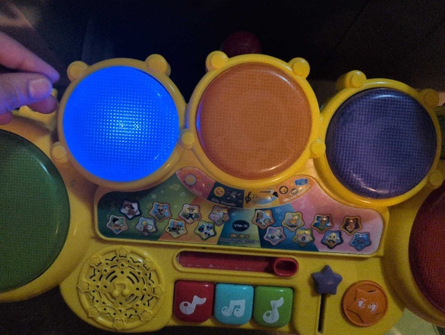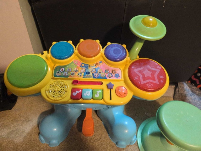 Get your little one grooving with this VTech KidiBeats drum set, perfect for developing a sense of rhythm and musicality! This interactive drum set features multiple drum pads and cymbal that light up with fun sounds and melodies, plus different play modes to encourage creativity. This is a used item, but has been well looked after. Additional specifications include: